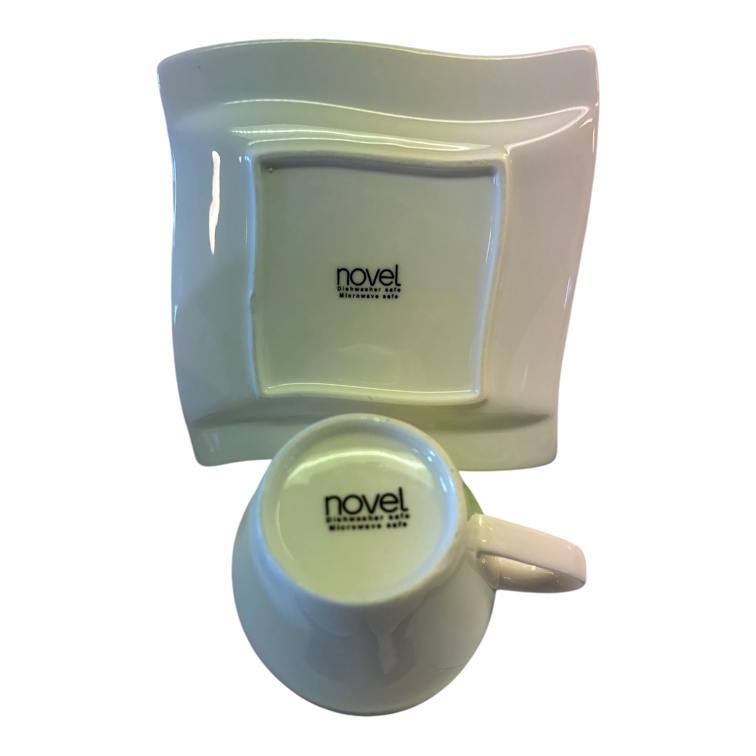 Kaffeservis i modern formgivning, märkt “Novel”, bestående av koppar med tillhörande fat i kvadratisk, svängd design. Den stilrena, vita glasyren i kombination med mjukt böljande former ger servisen ett samtida och elegant uttryck.