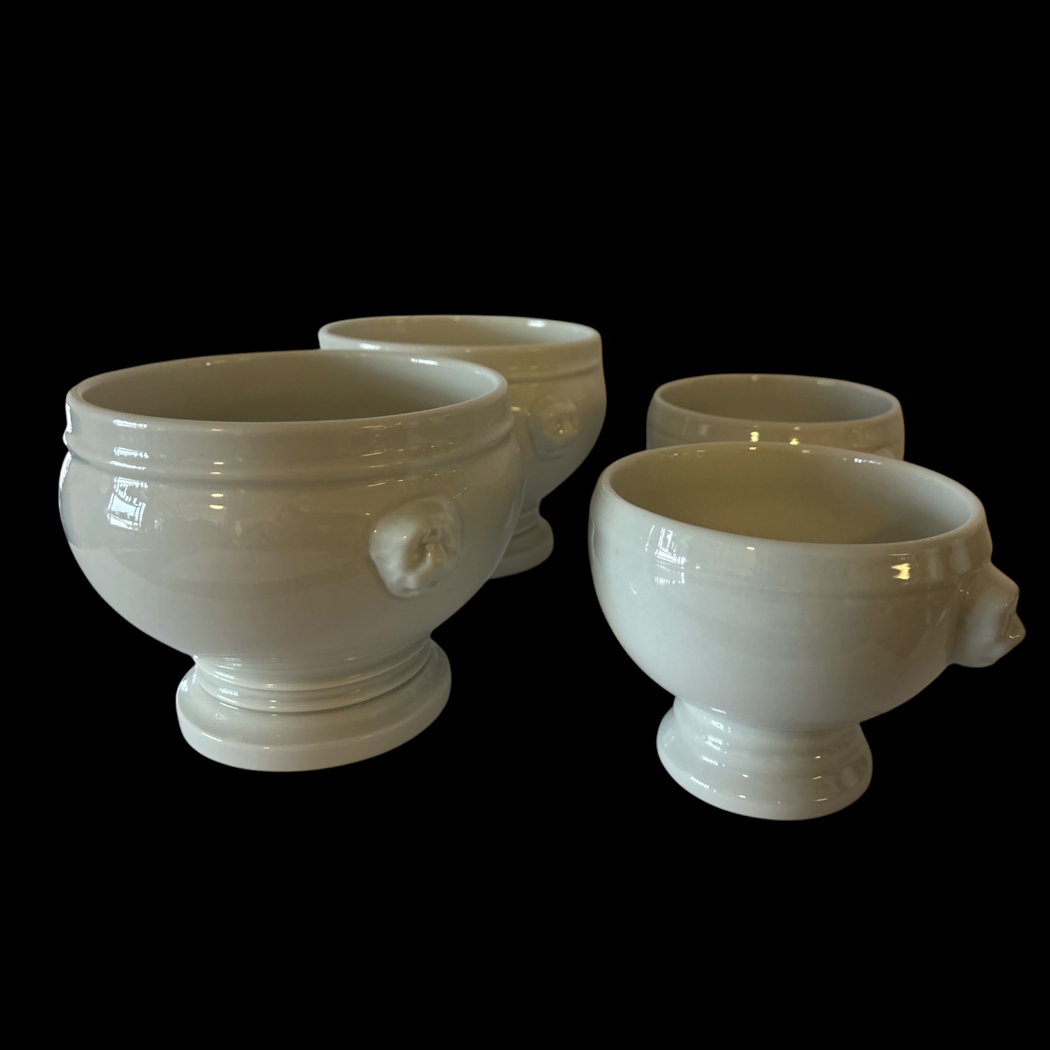 Parti glas- och porslinsföremål i varierande utföranden, bestående av fyra soppskålar i vitt porslin samt en samling glas i olika modeller. Två av porslinsskålarna är märkta undertill, medan övriga är omärkta.