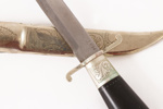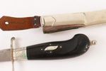 Handtag i ebenholts, med metallinläggningar. Förnicklad slida med graverad dekor. Stålblad, monogramsignerat JFH.