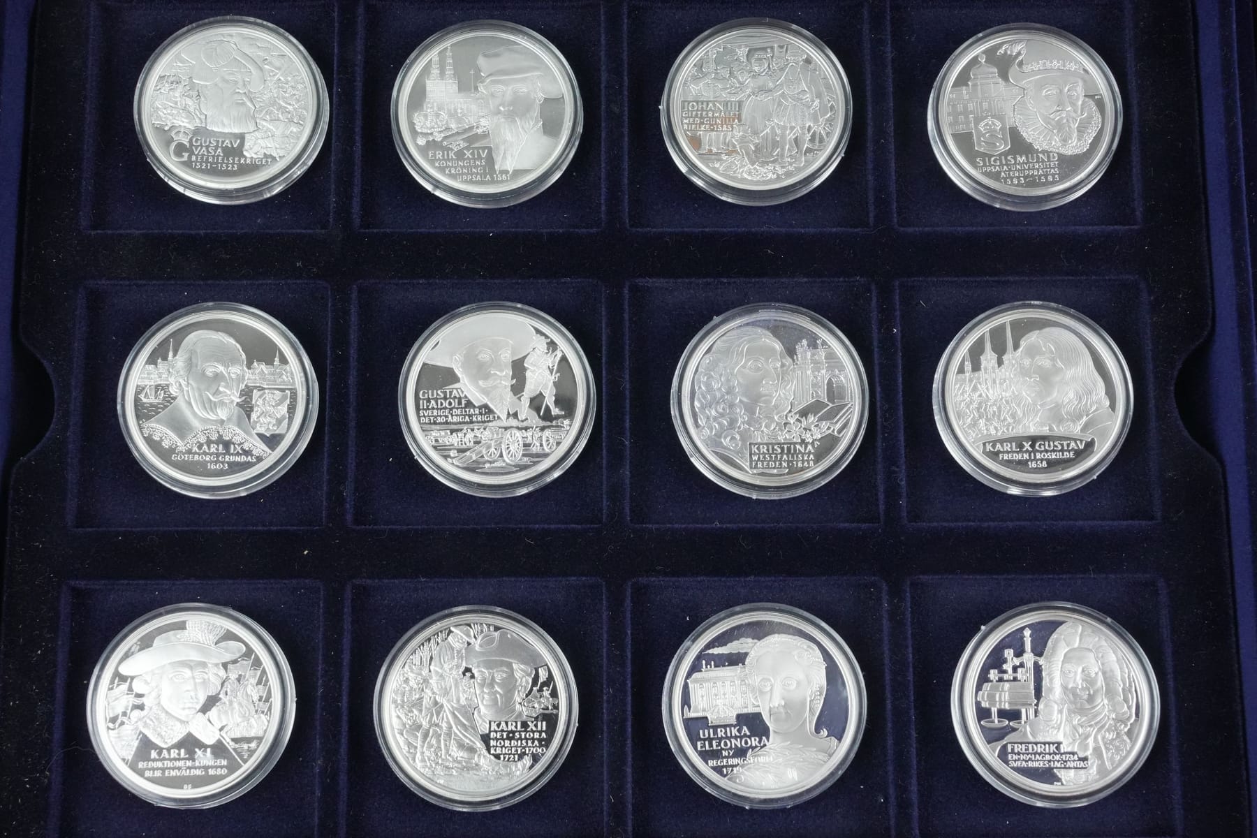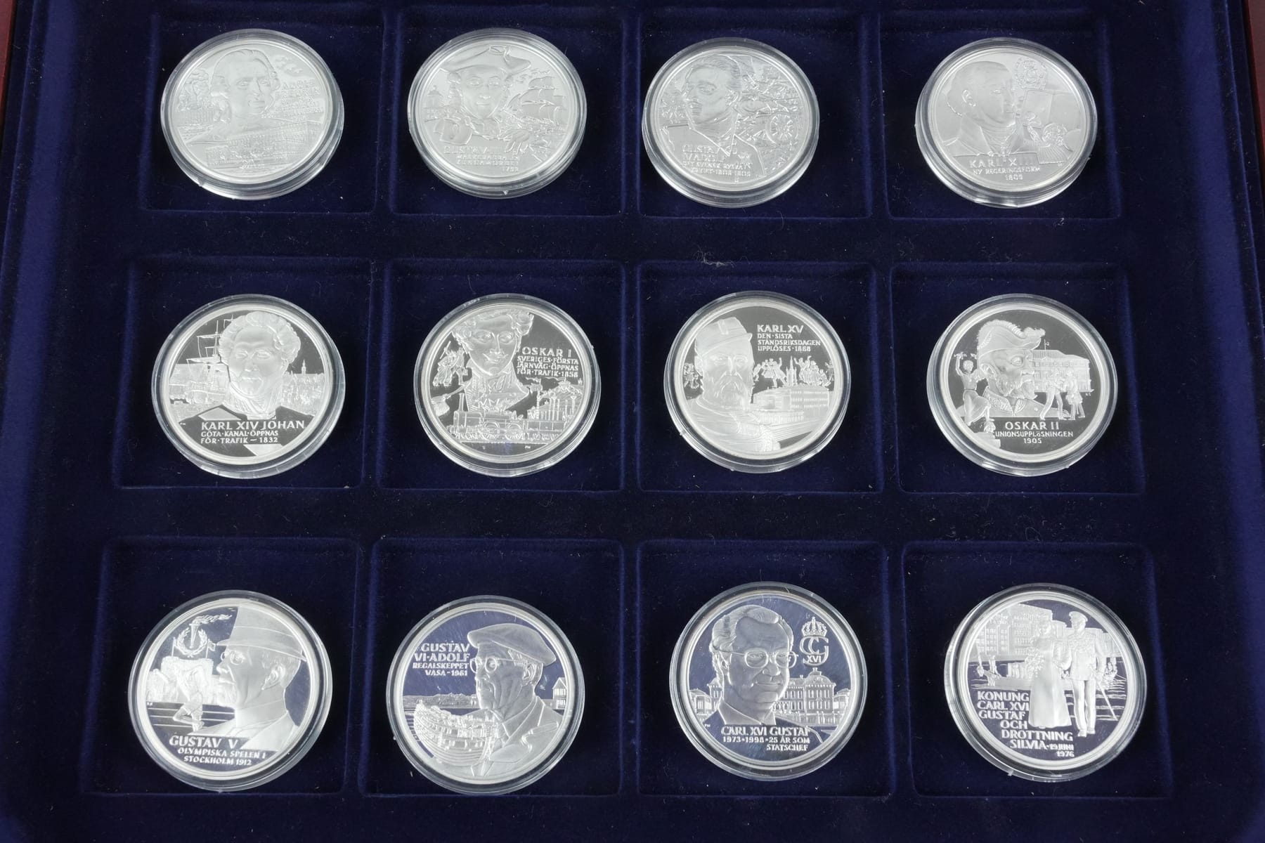 Bilder SAMLARMEDALJER, 24 st, silver, 925/1000, i schatull, "Sveriges regenter"