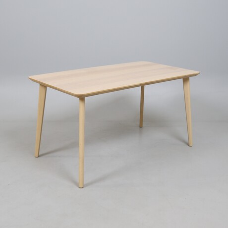 BORDSLAMPA Harald Notini märkt "15339", Arvid Böhlmarks Lampfabrik, Stockholm, 1940-tal. Mattborstad mässing, pelare av räfflad och bonad alm H:45 cm D:35 cm (bruksslitage, mindre bucklor förekommer)