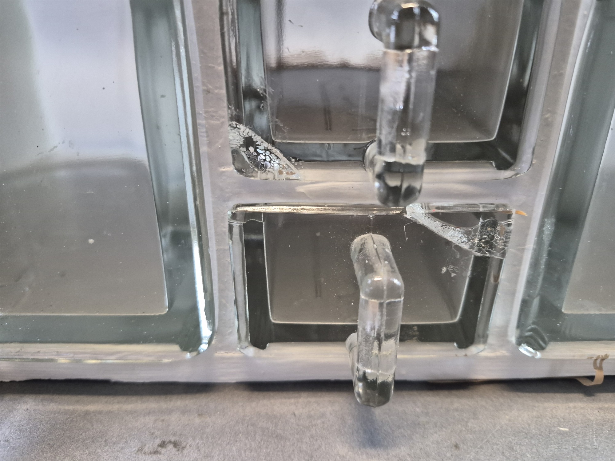 Auktioner Husgeråd & Vitvaror Kryddhylla med glasskeppor, några är lagade, höjd 34.5 cm, bredd 38.5 cm