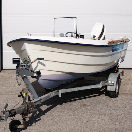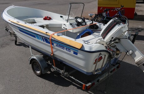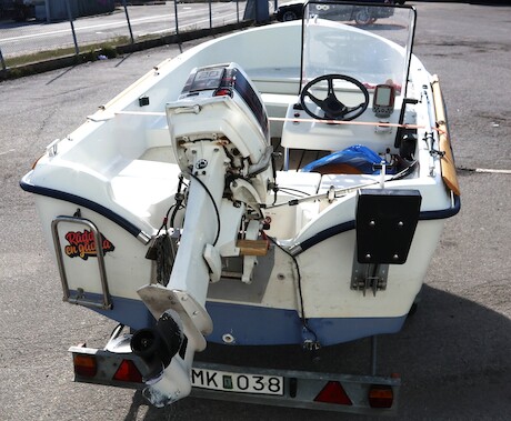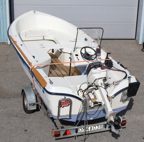 Styrepulpet Ryds 435 DL årsmodell 1997 med motor Johnsson 20hk och 80 släp ULGU-METALL BT 600ES Årsmodell 1989, OMK 038, besiktigat tom 3/2027. Medföljer bl.a. Ekolod, Ankare, fendrar, fiskeredskap, bojor, linor mm. Båten är förberedd för El-Trollingmotor. Startbatteri finns.