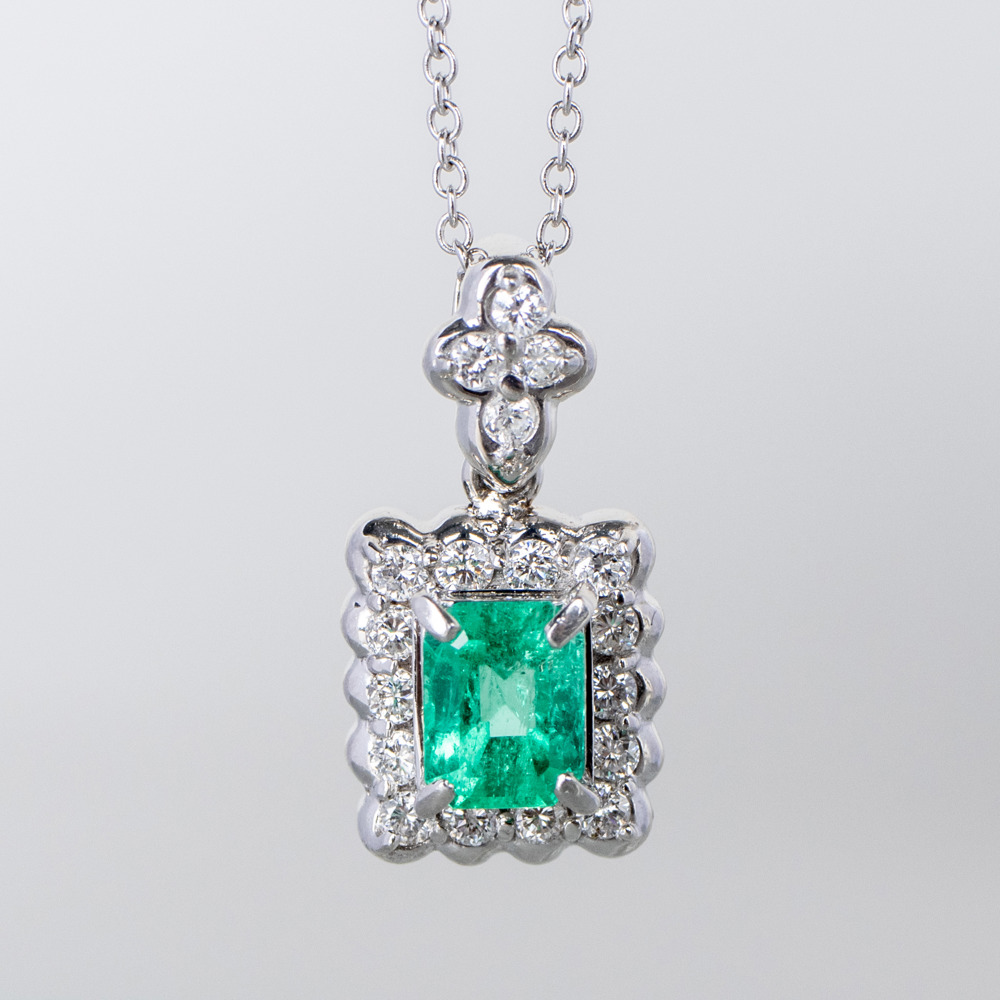 HÄNGE MED KEDJA, platina, smaragd ca 0.58 ct och briljantslipade diamanter tot ca 0.27 ct