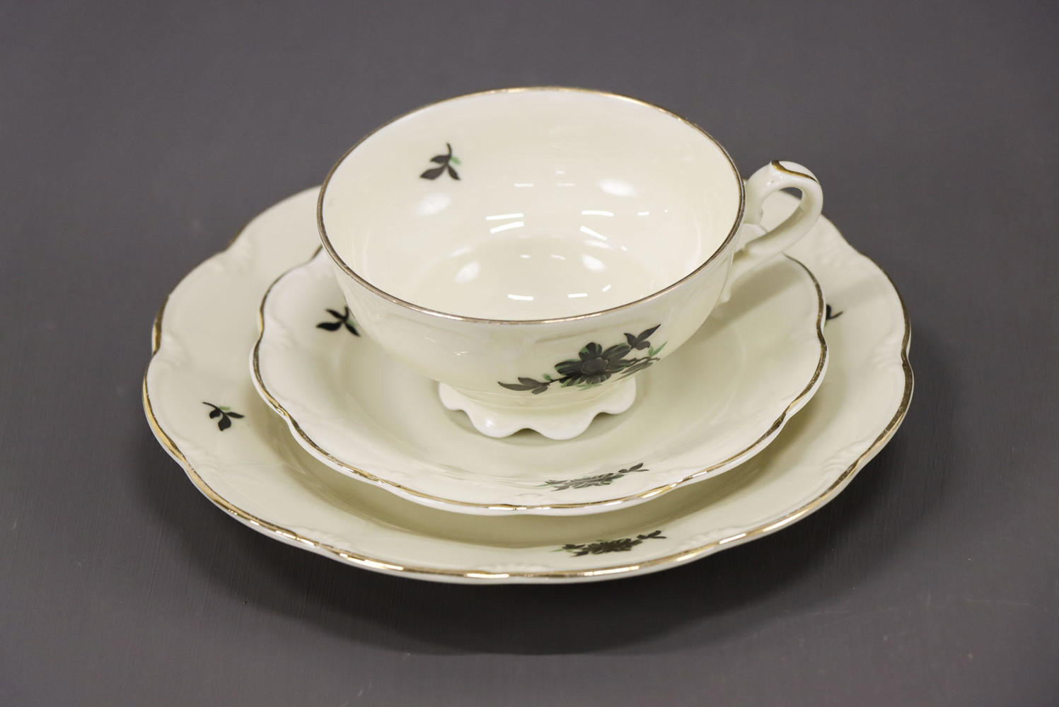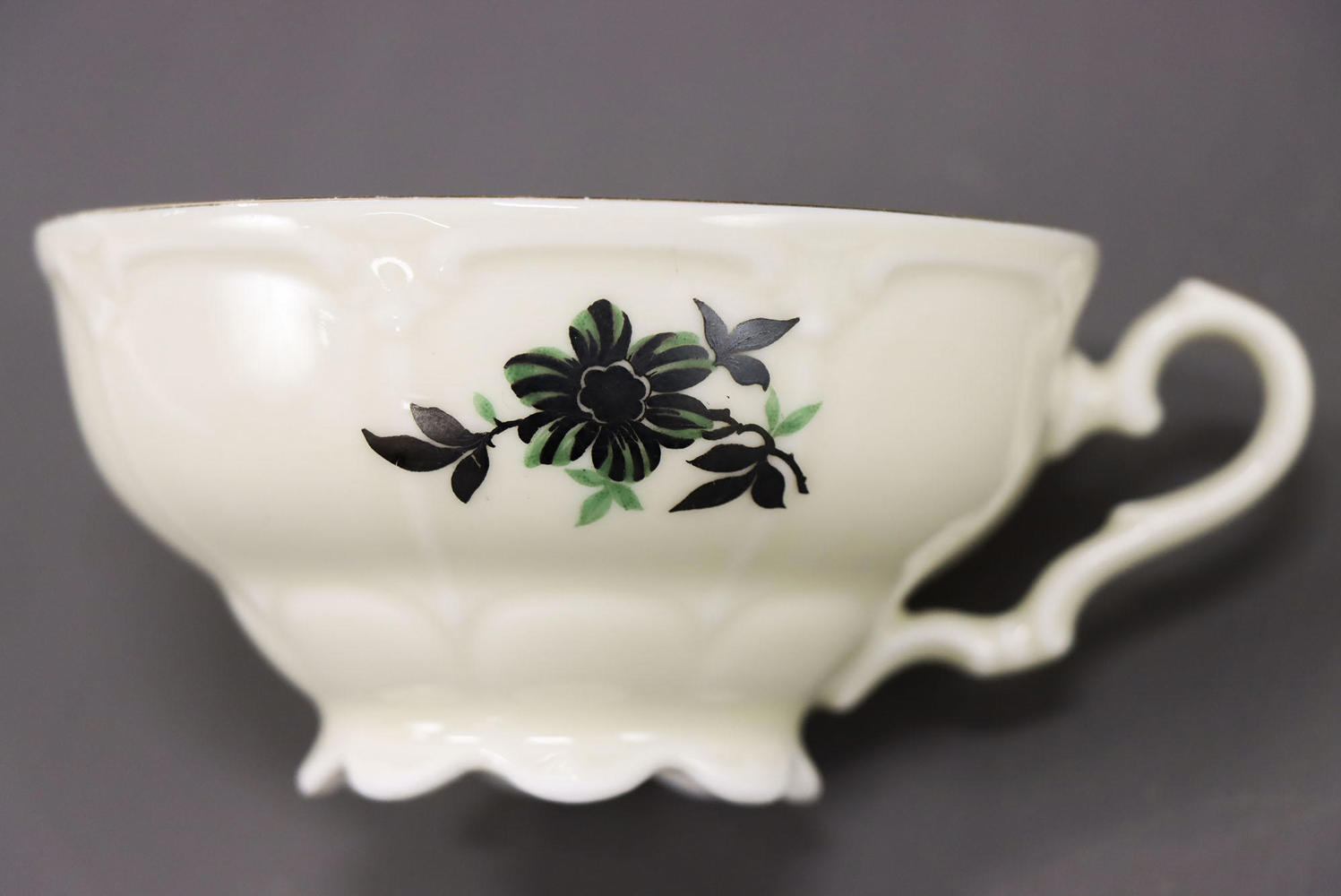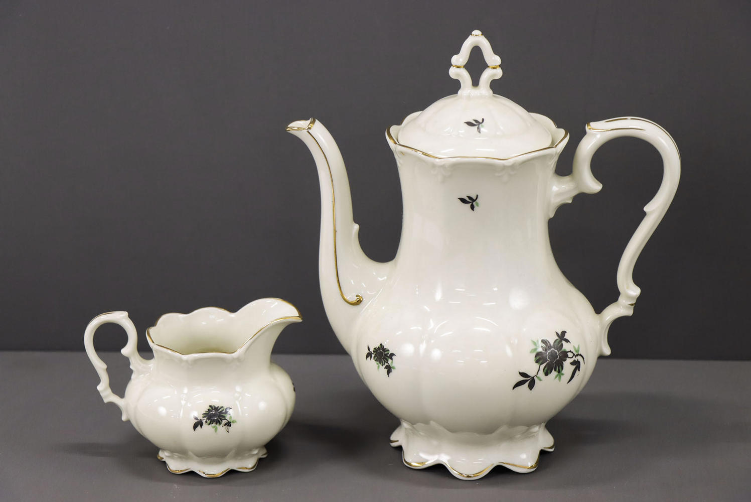 Tillverkad under 1900-talets andra kvartal, fint skick, lättare spår av användning. Gräddvit med guldkant, dekor i svart & grönt. 10 st kaffekoppar, höjd: ca 5 cm, diameter: ca 9 cm. 10 st kaffefat, diameter: ca 13 cm. 10 st assietter, diameter: 17 cm. 1 st kaffekanna, höjd: 24 cm. 1 st gräddkanna, höjd: 8,5 cm. 1 st sockerskål, höjd: 11,5 cm.