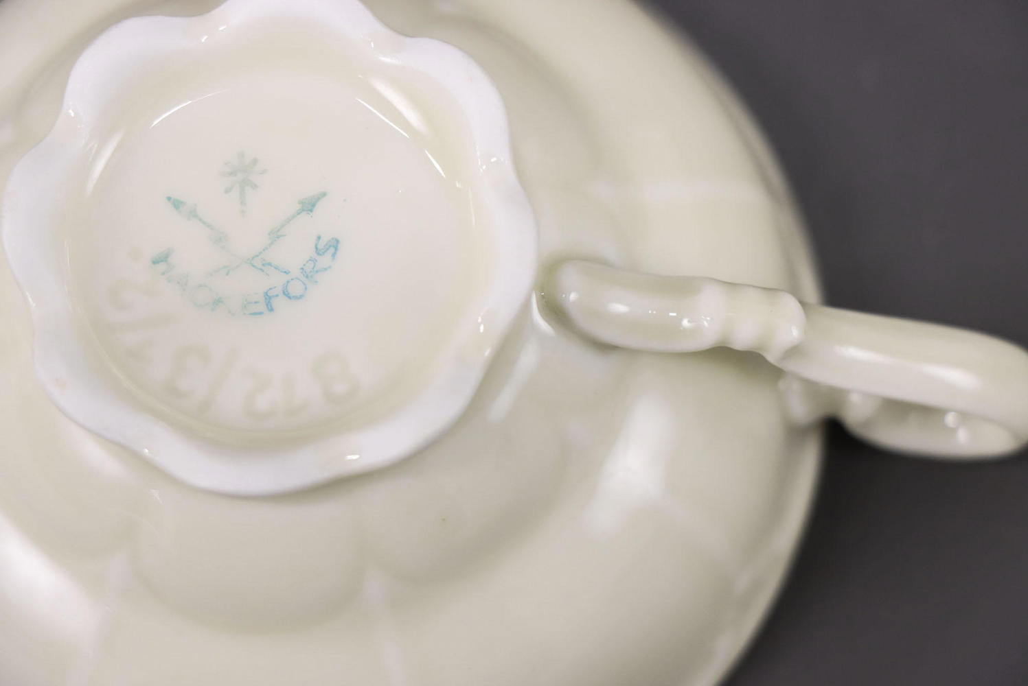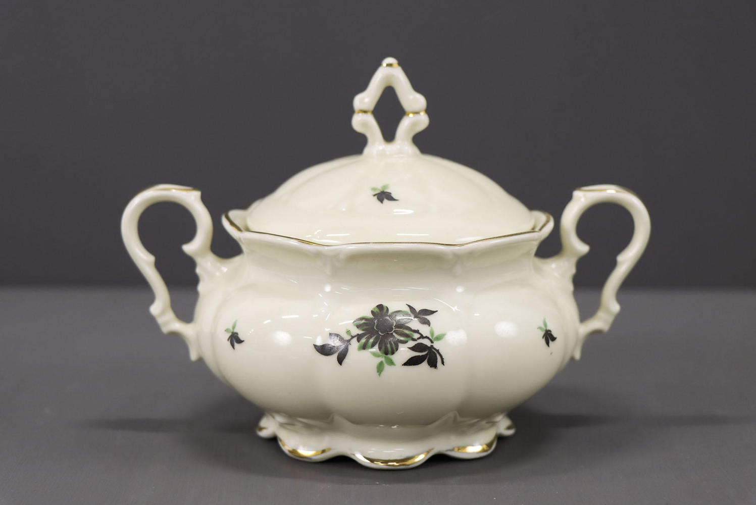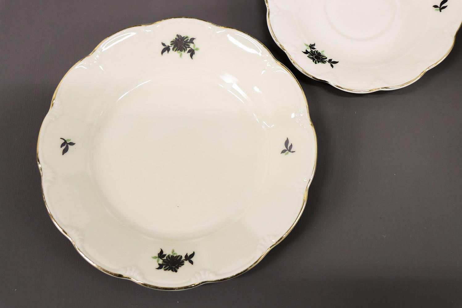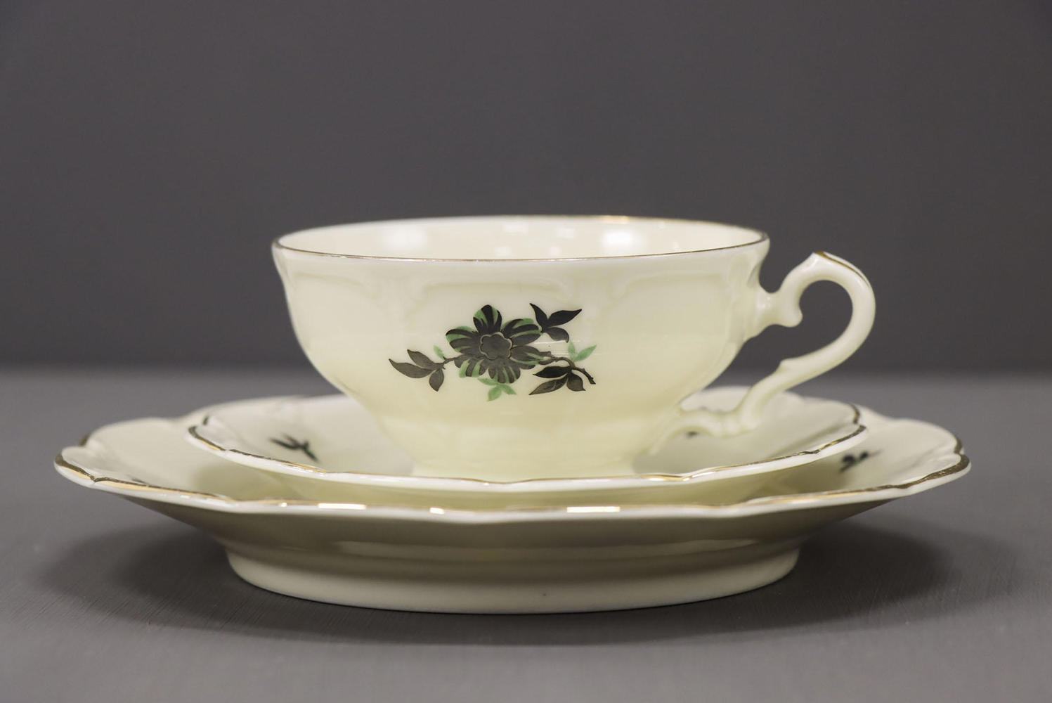 Tillverkad under 1900-talets andra kvartal, fint skick, lättare spår av användning. Gräddvit med guldkant, dekor i svart & grönt. 10 st kaffekoppar, höjd: ca 5 cm, diameter: ca 9 cm. 10 st kaffefat, diameter: ca 13 cm. 10 st assietter, diameter: 17 cm. 1 st kaffekanna, höjd: 24 cm. 1 st gräddkanna, höjd: 8,5 cm. 1 st sockerskål, höjd: 11,5 cm.