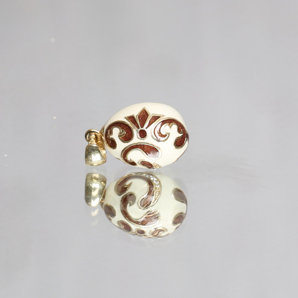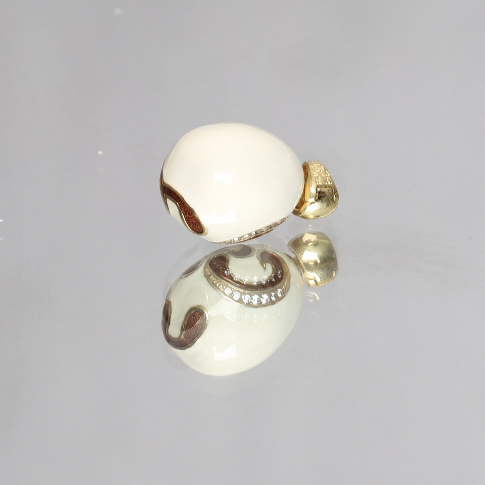 PENDANT, egg, gilded silver, white/brown enamel, cz, design Carl Fabergé by A Jewel Veronika / HÄNGE, ägg, förgyllt silver, vit/brun emalj, cz, design Carl Fabergé by A Jewel Veronika.