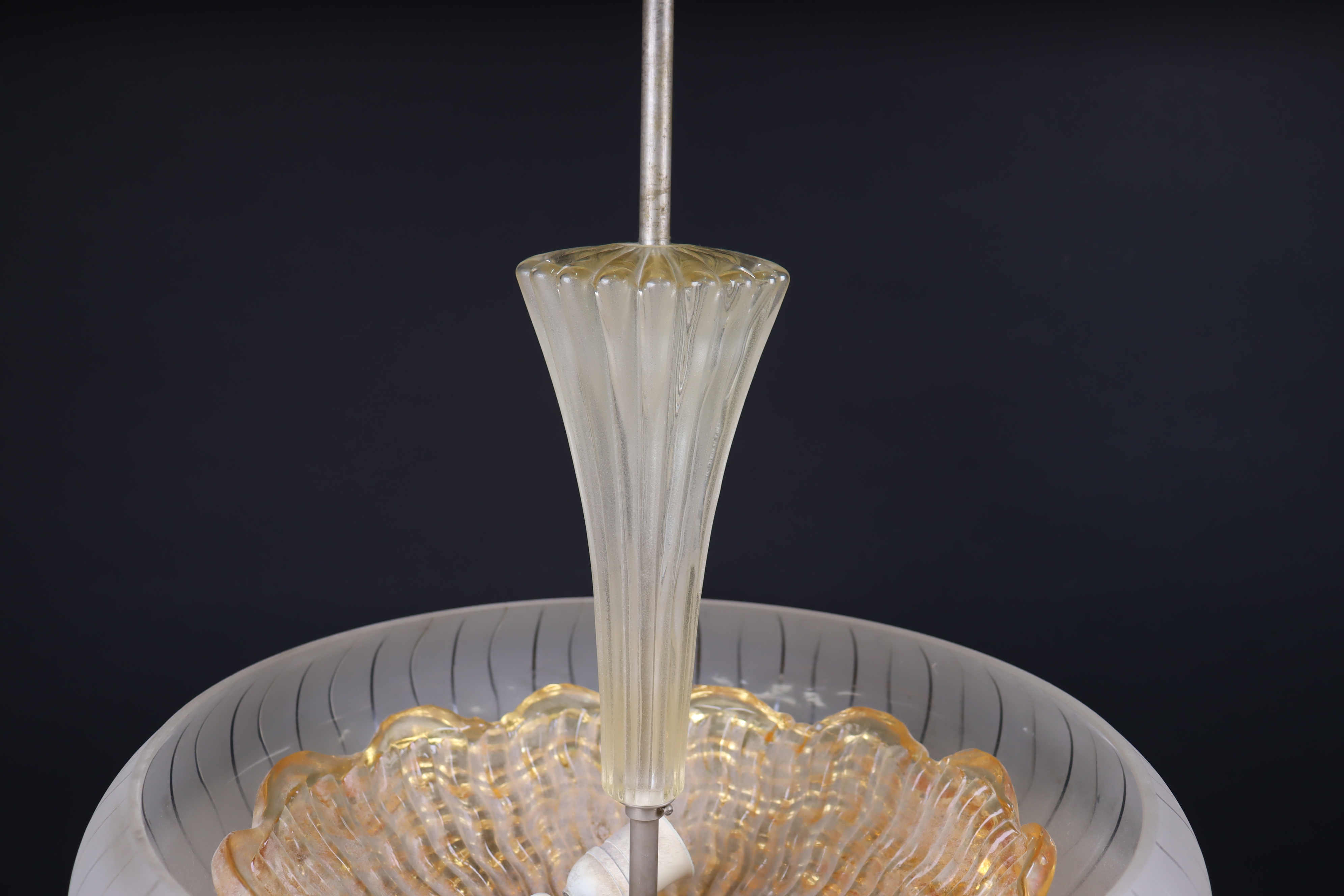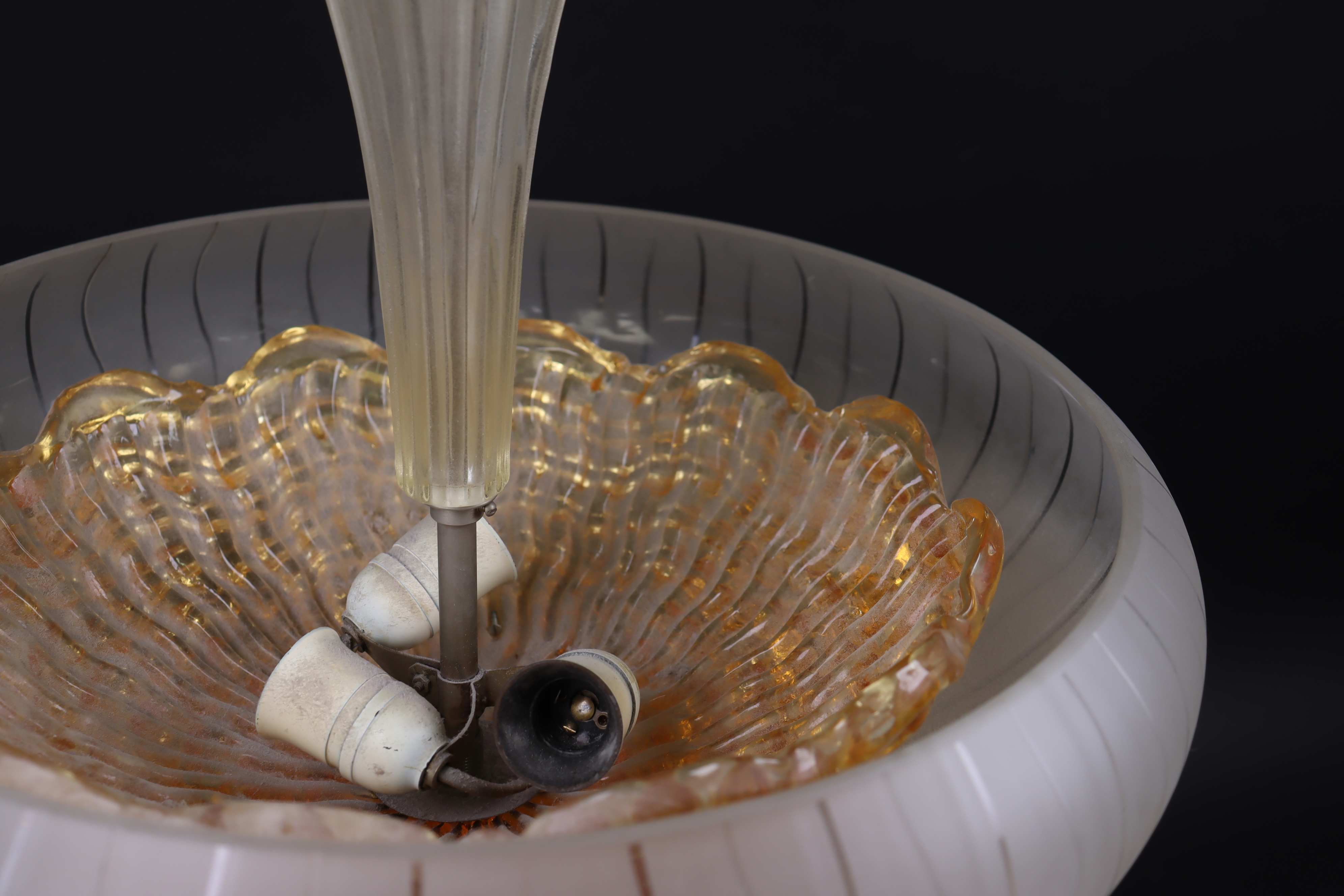 Dubbla skärmar av gultonat respektive delvis frostat glas. Tre ljuspunkter. Behöver rengöras.