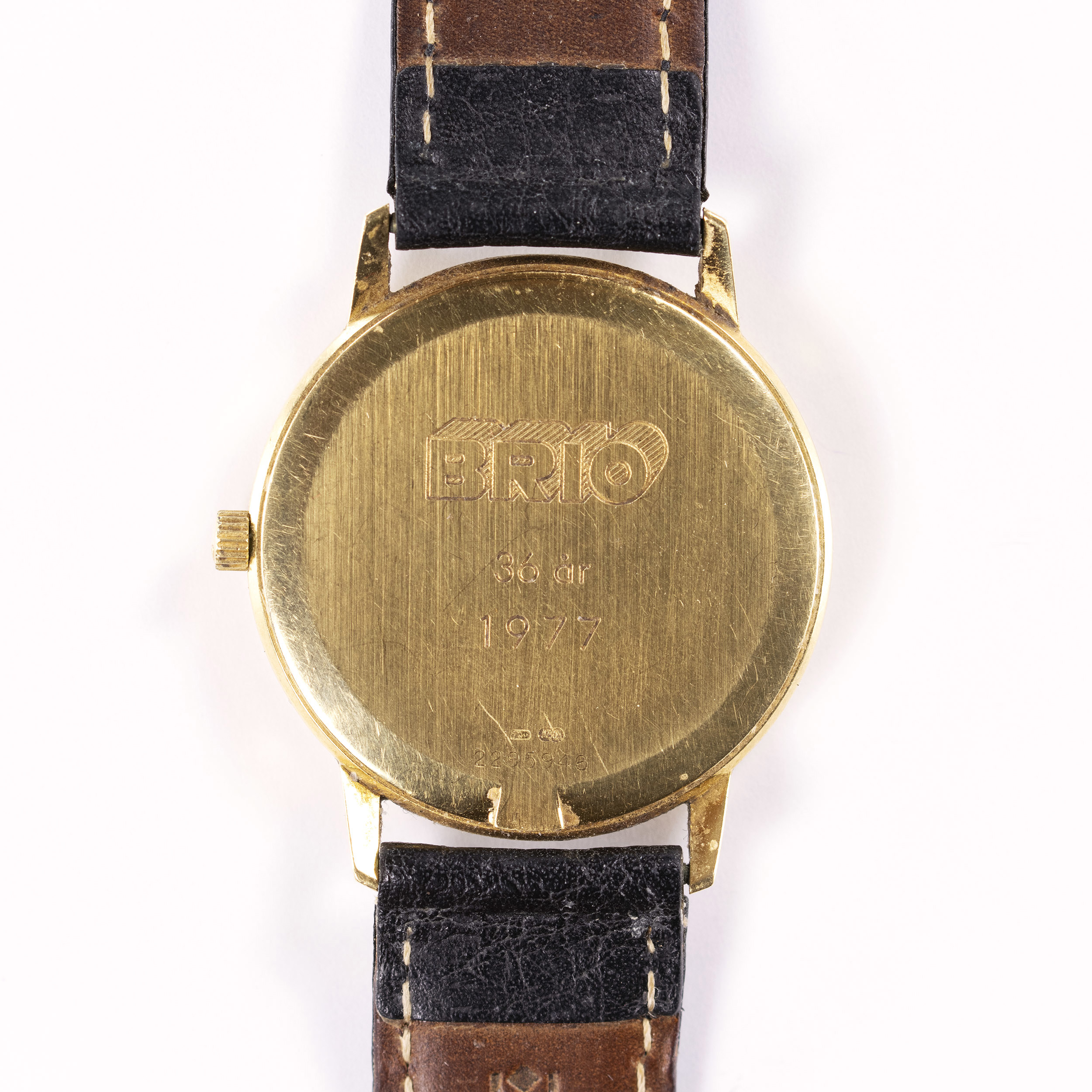 Ca 33 mm exkl. krona (38,5 mm lug-to-lug), 18k guld, klämboett, bakboett med gravyr "Brio 36 år1977", signerad krona, safirglas