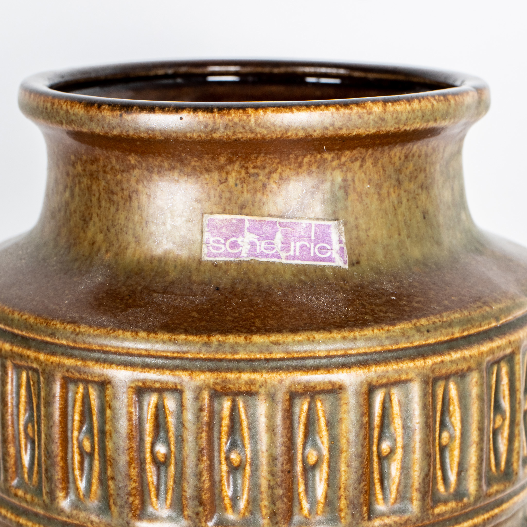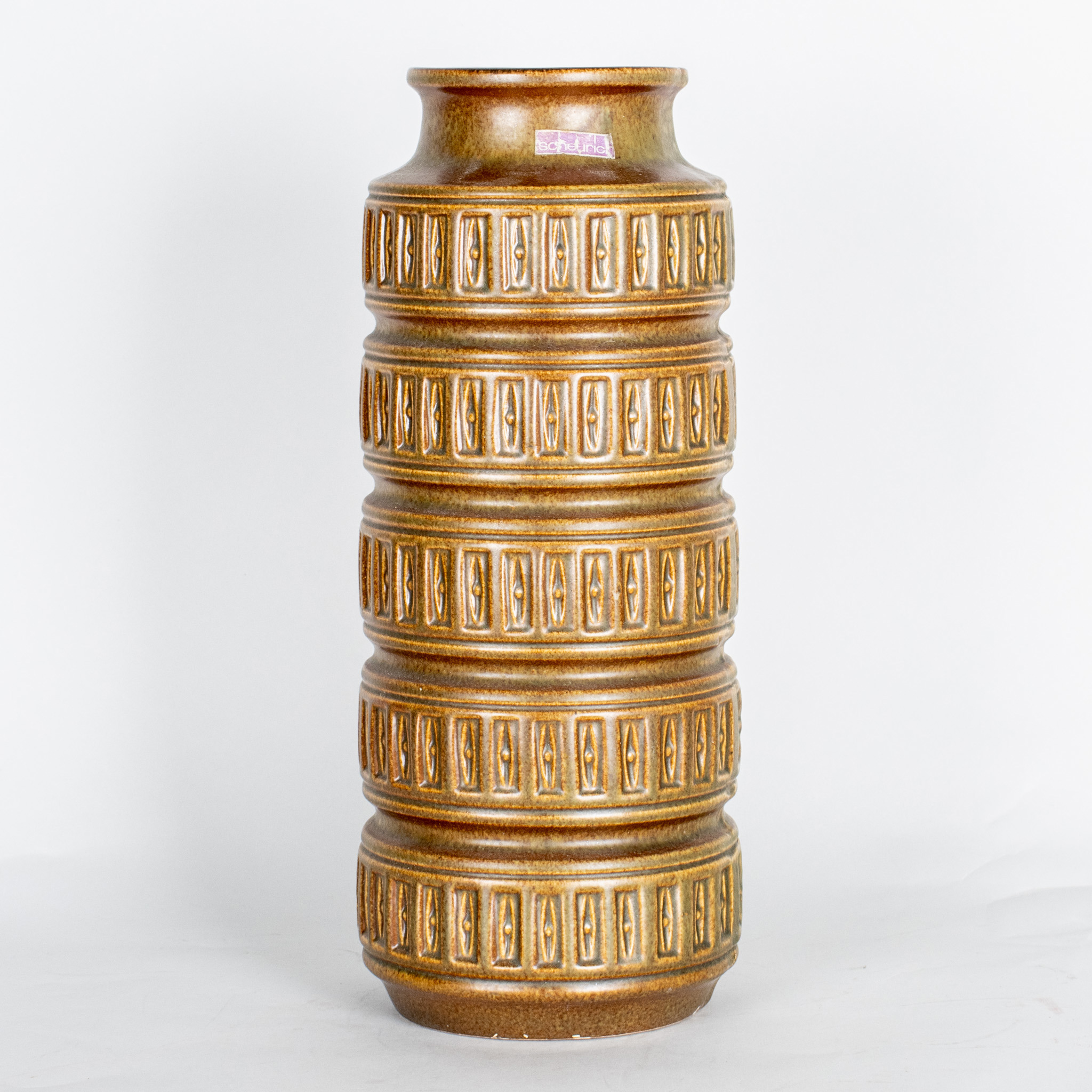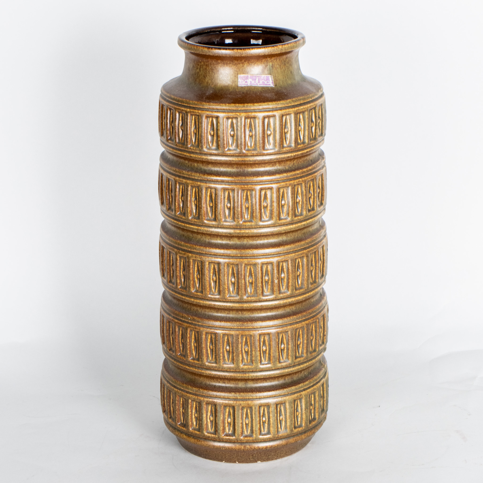 Brun glasyr med reliefdekor, etikettmärkt, höjd ca 41 cm