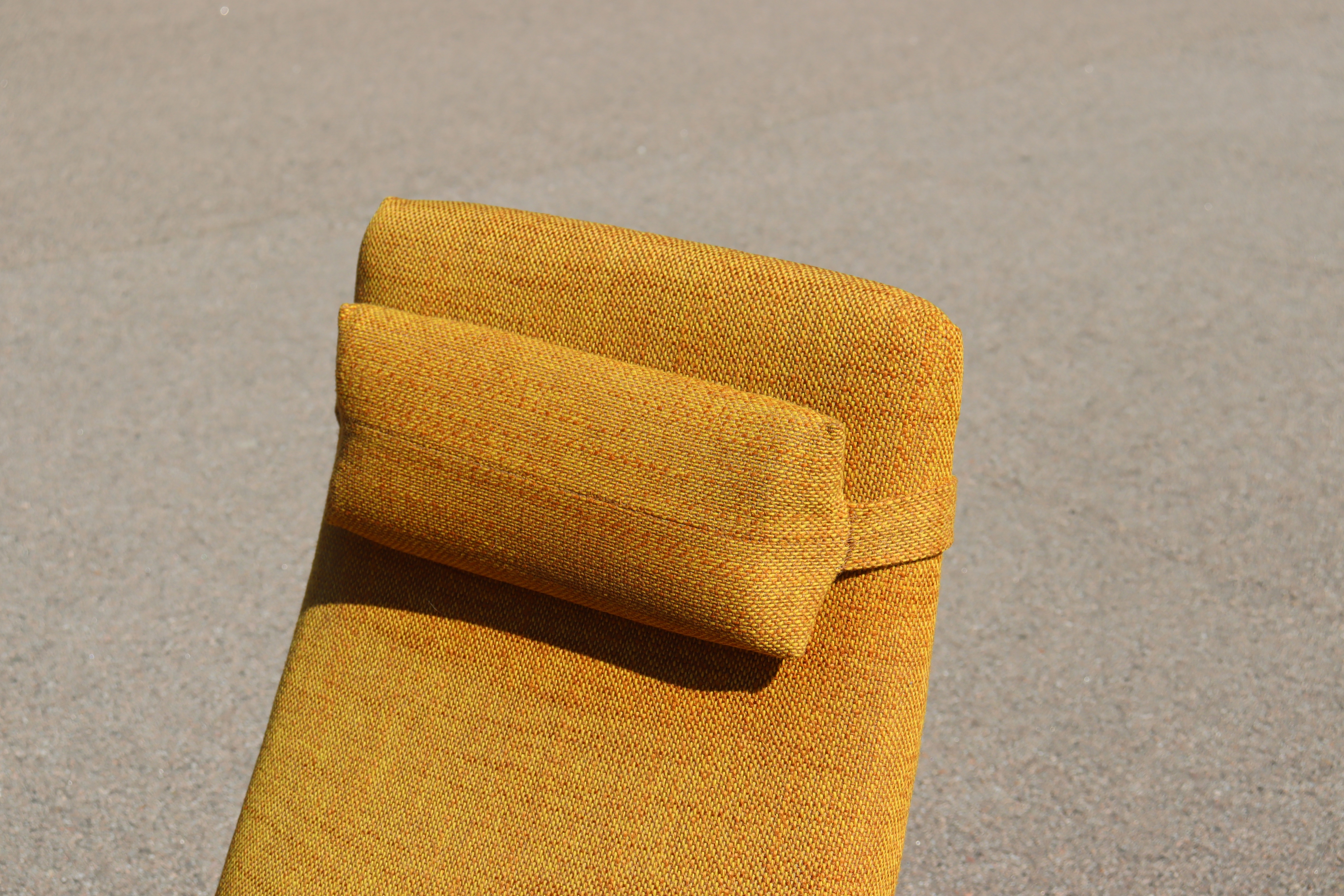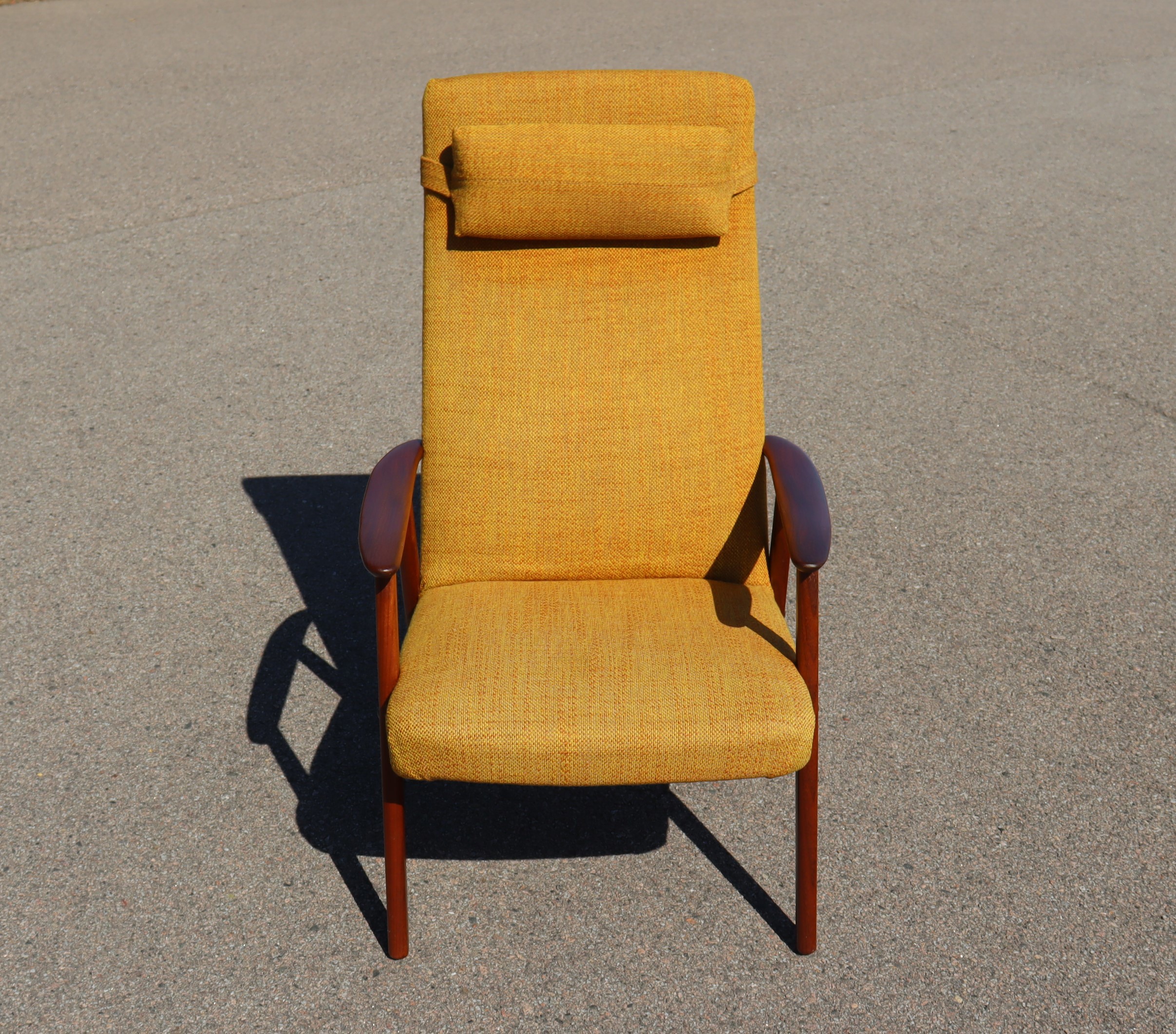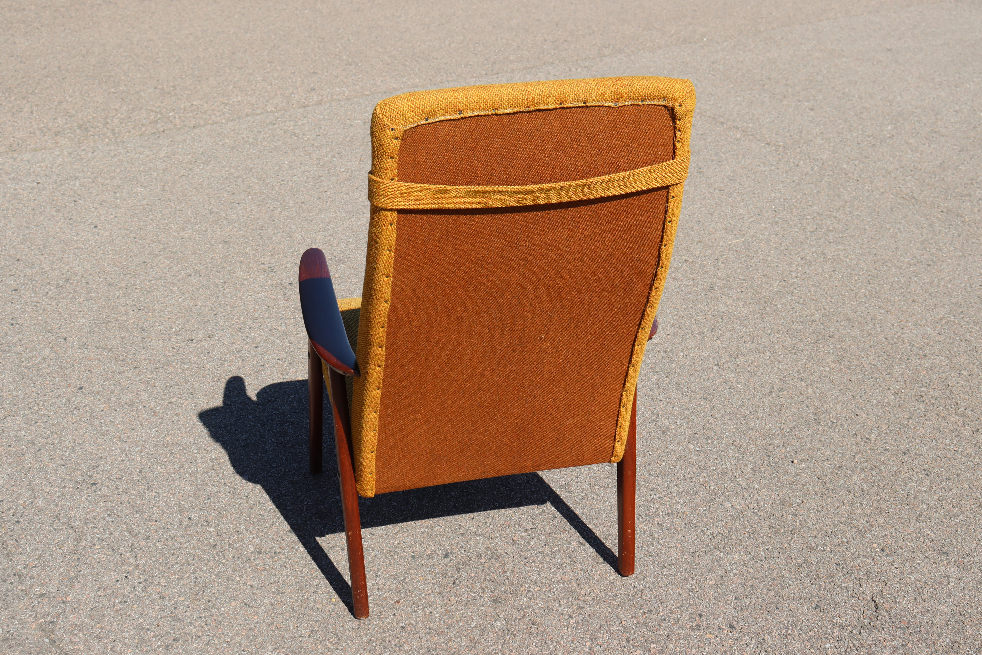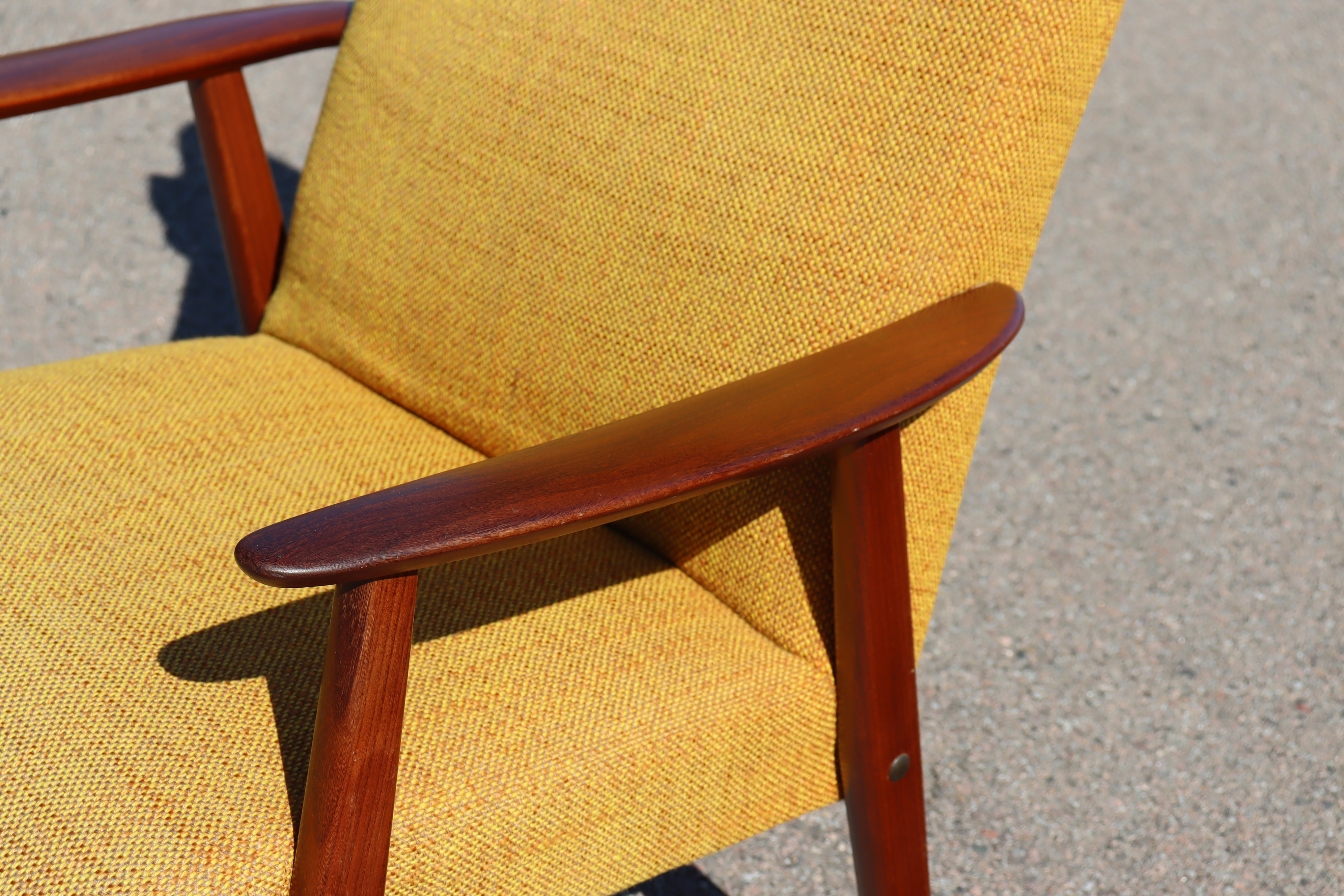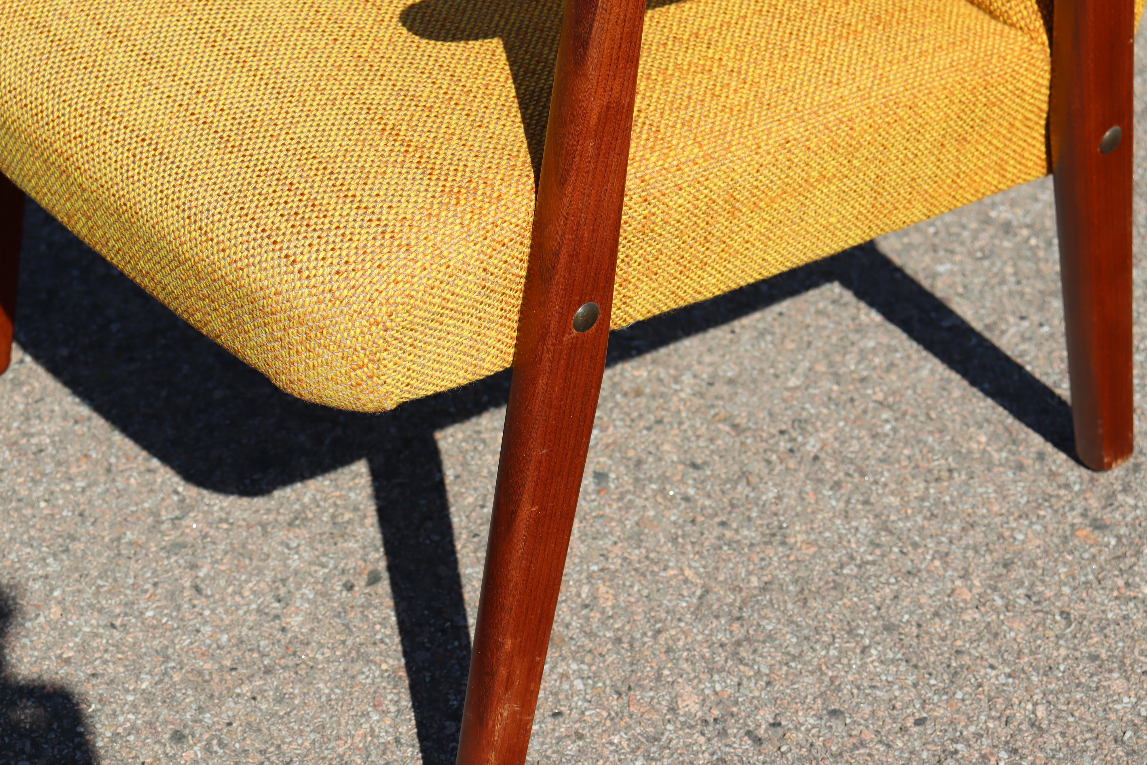 Fåtölj, stomme i teak, senapsgul tygklädsel, 1950/60-tal
