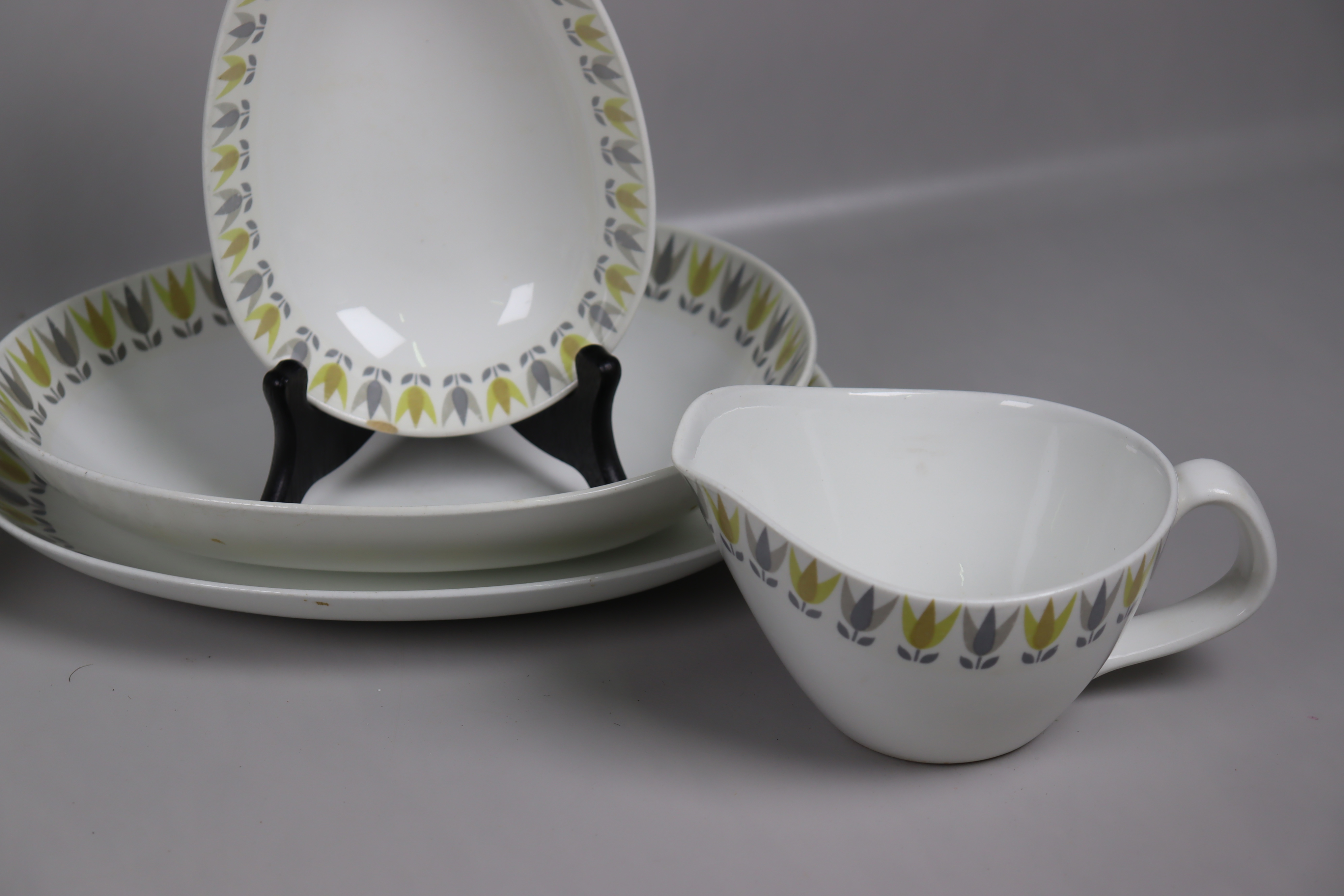 Stora och lilla fatet samt en djup tallrik har ett kantnagg.