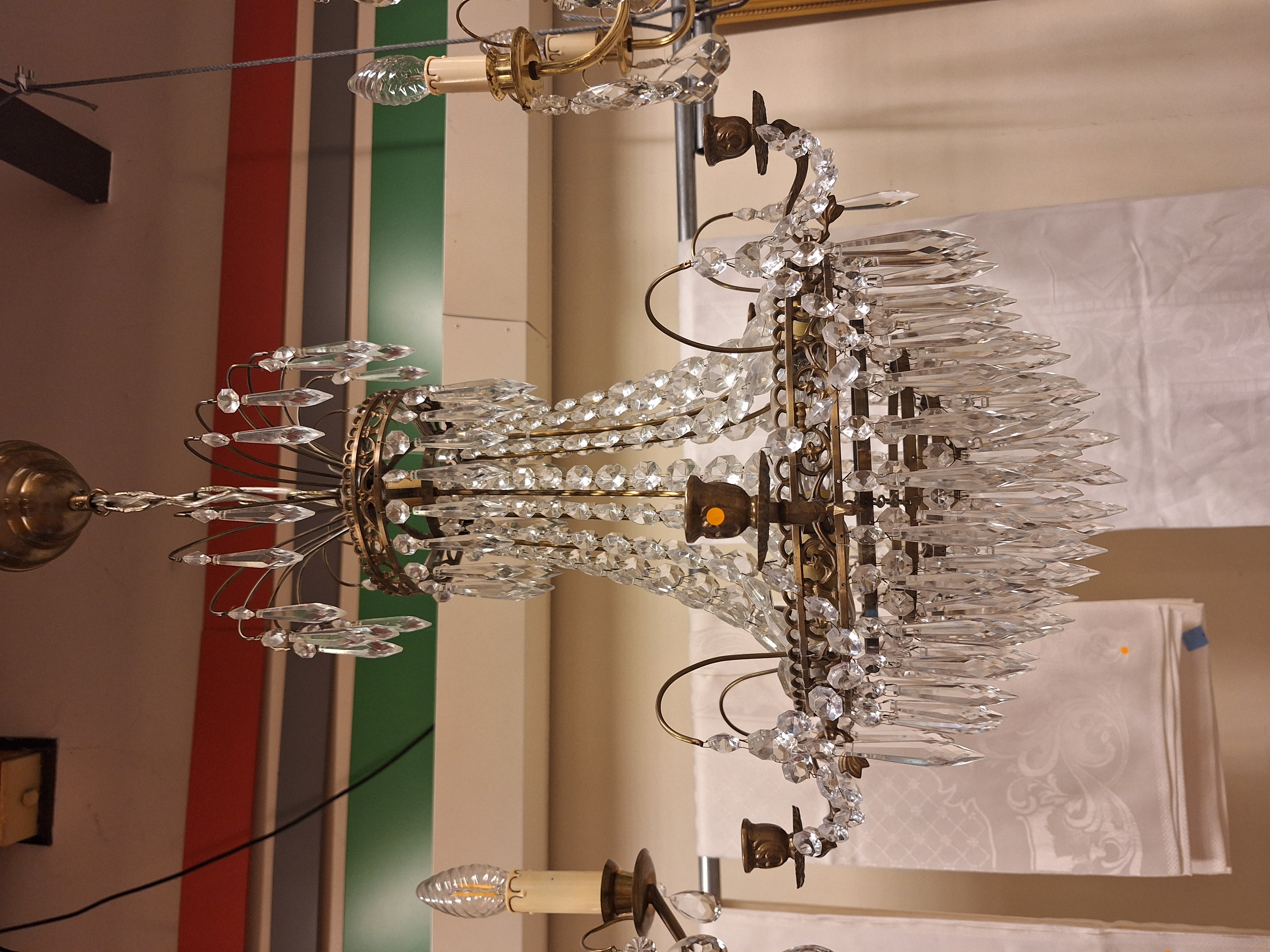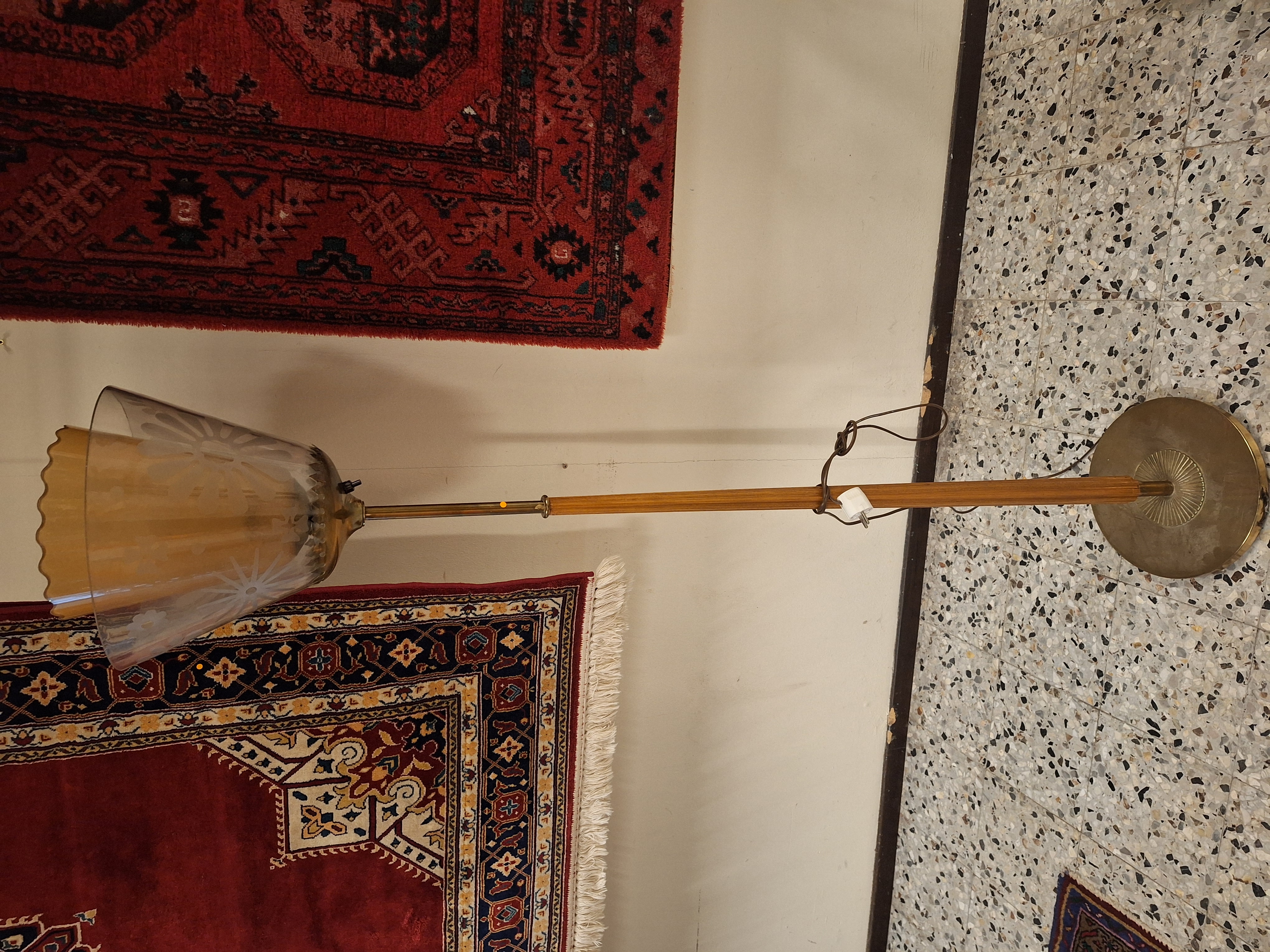 Table lamp in brass with white glass screen.