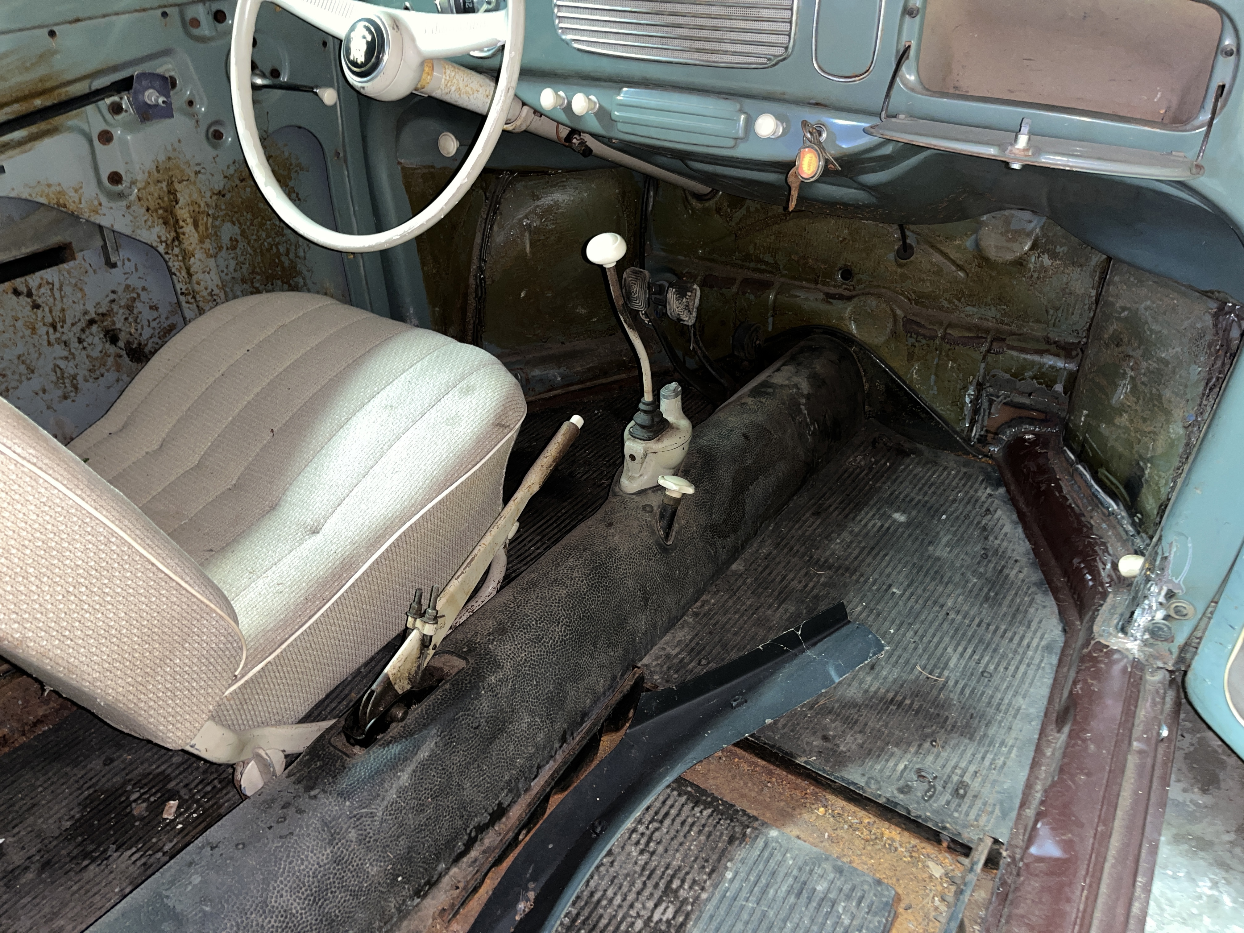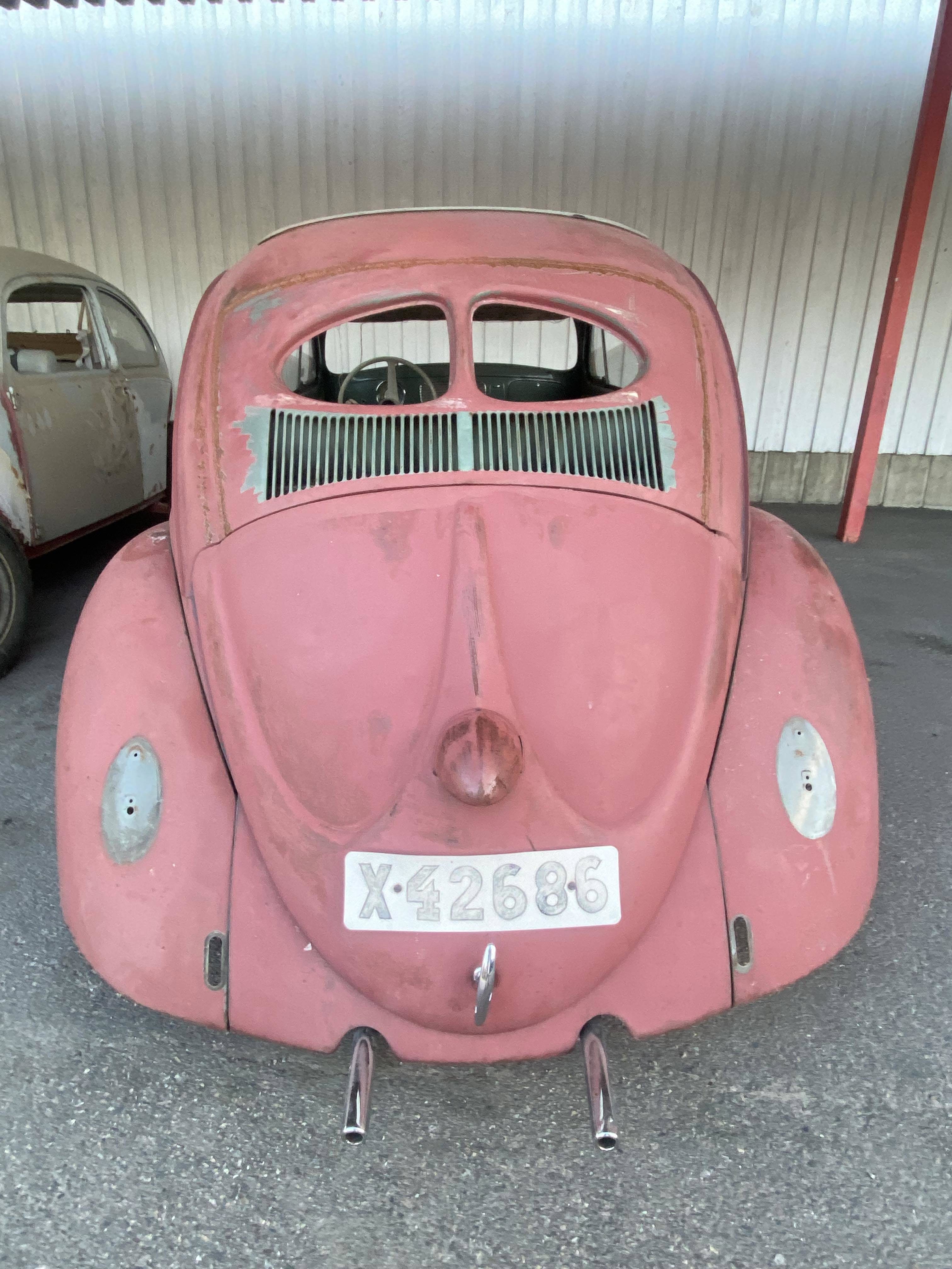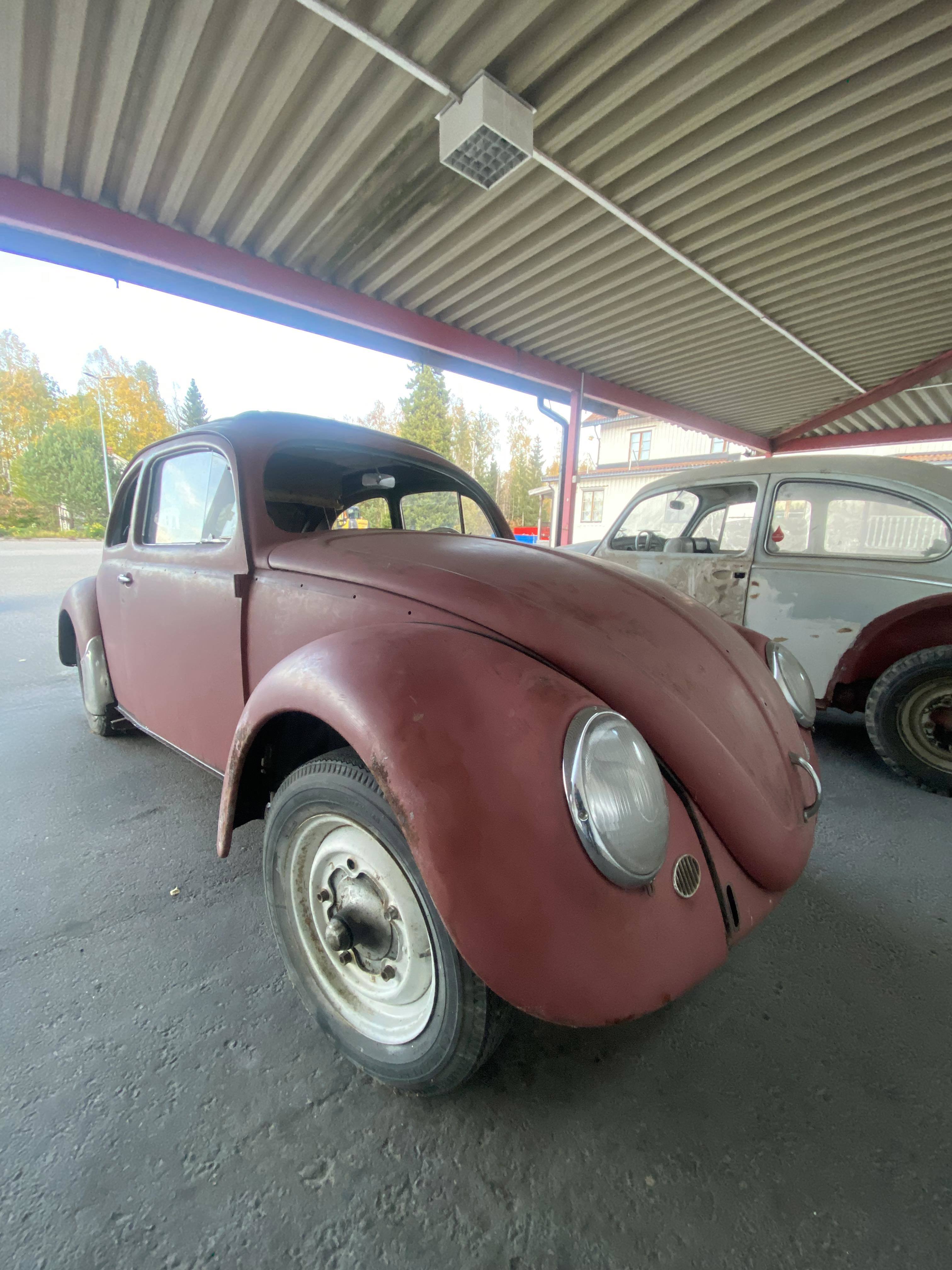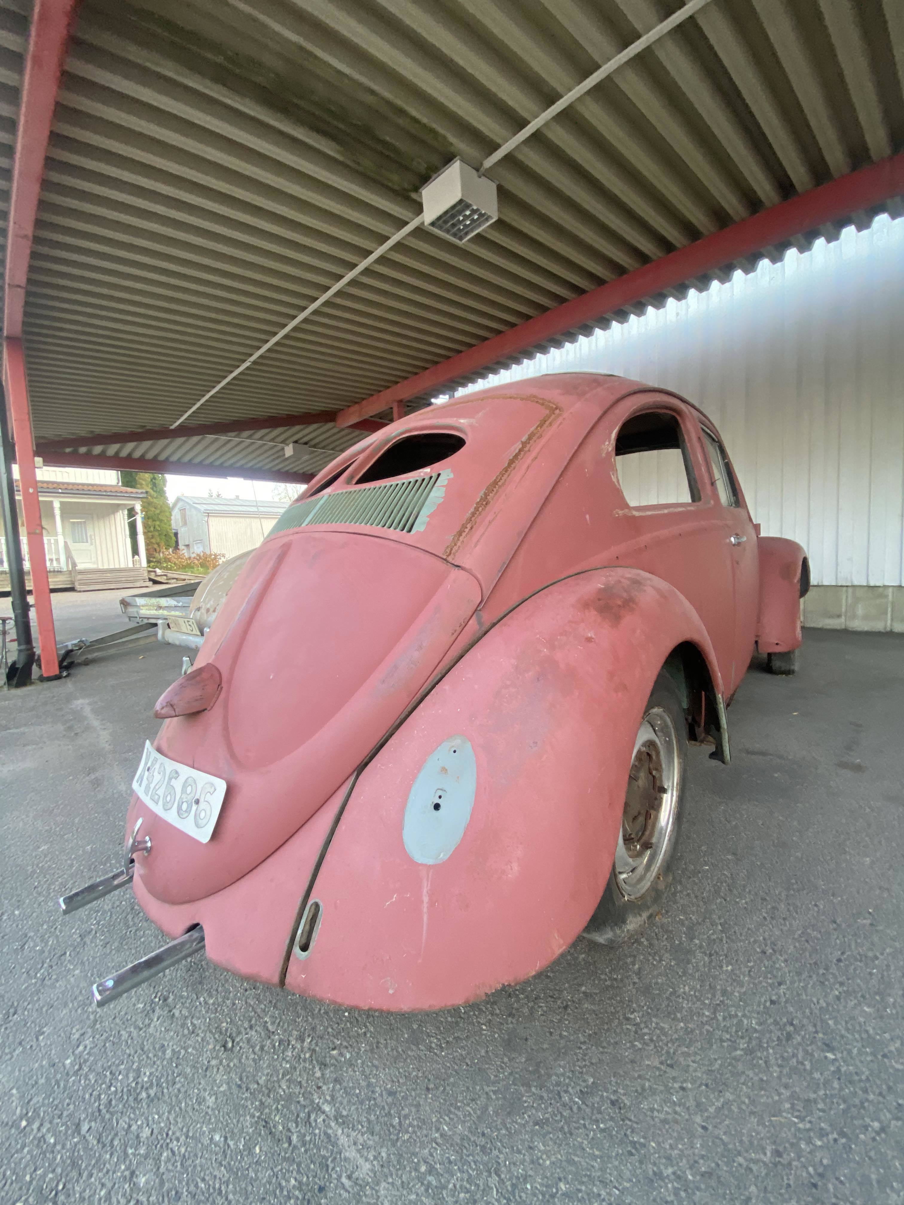 Modifierad med äldre bakruta och original VW soltak. Höger värmekanal bytt, vänster kanal medföljer löst. Medföljer diverse delar, både nytt & gammalt. Rutor finns, framruta trasig. Motorn utbytt, nu sitter en industrimotor från brandspruta i bilen. Renoveringsobjekt.