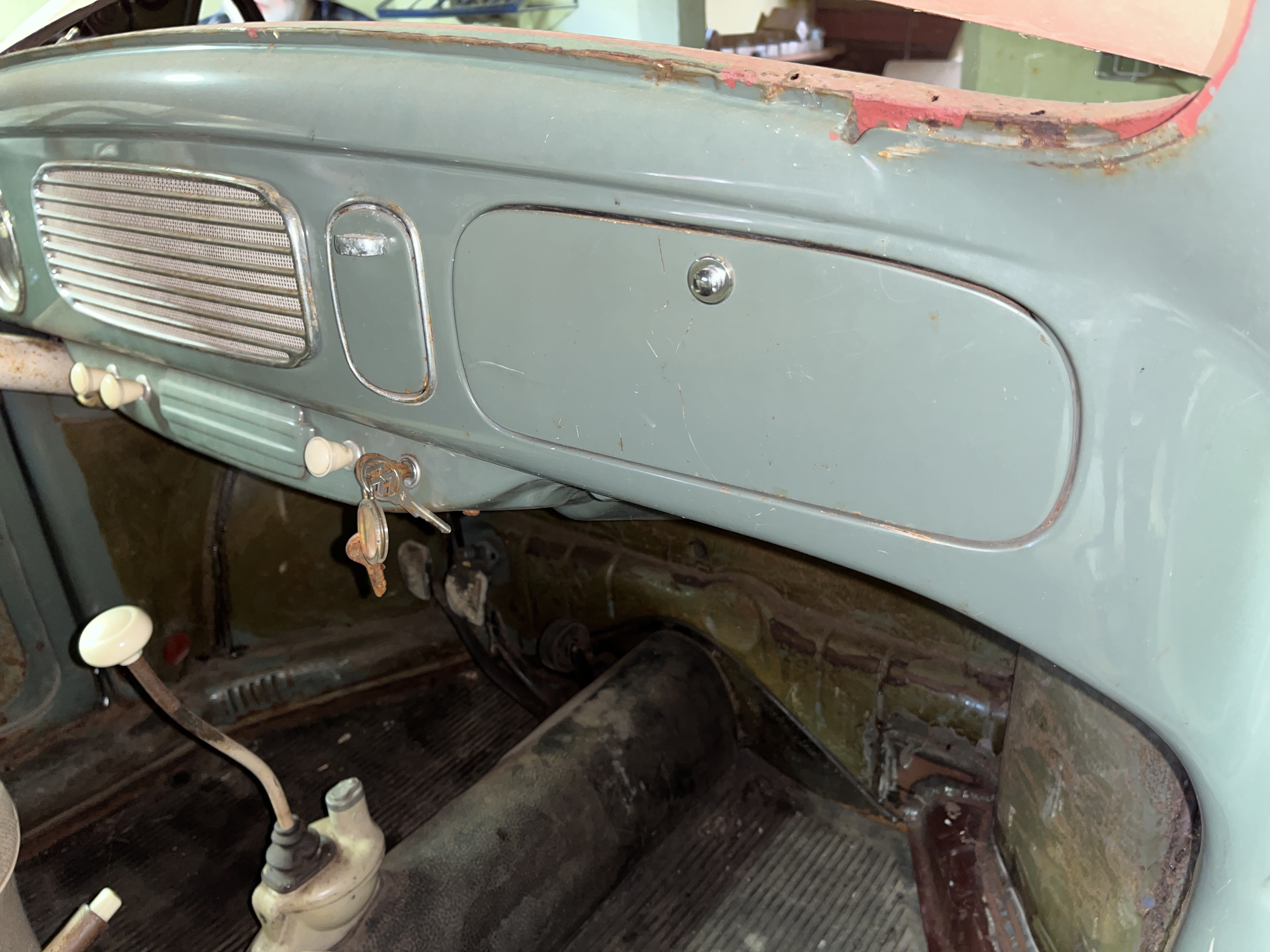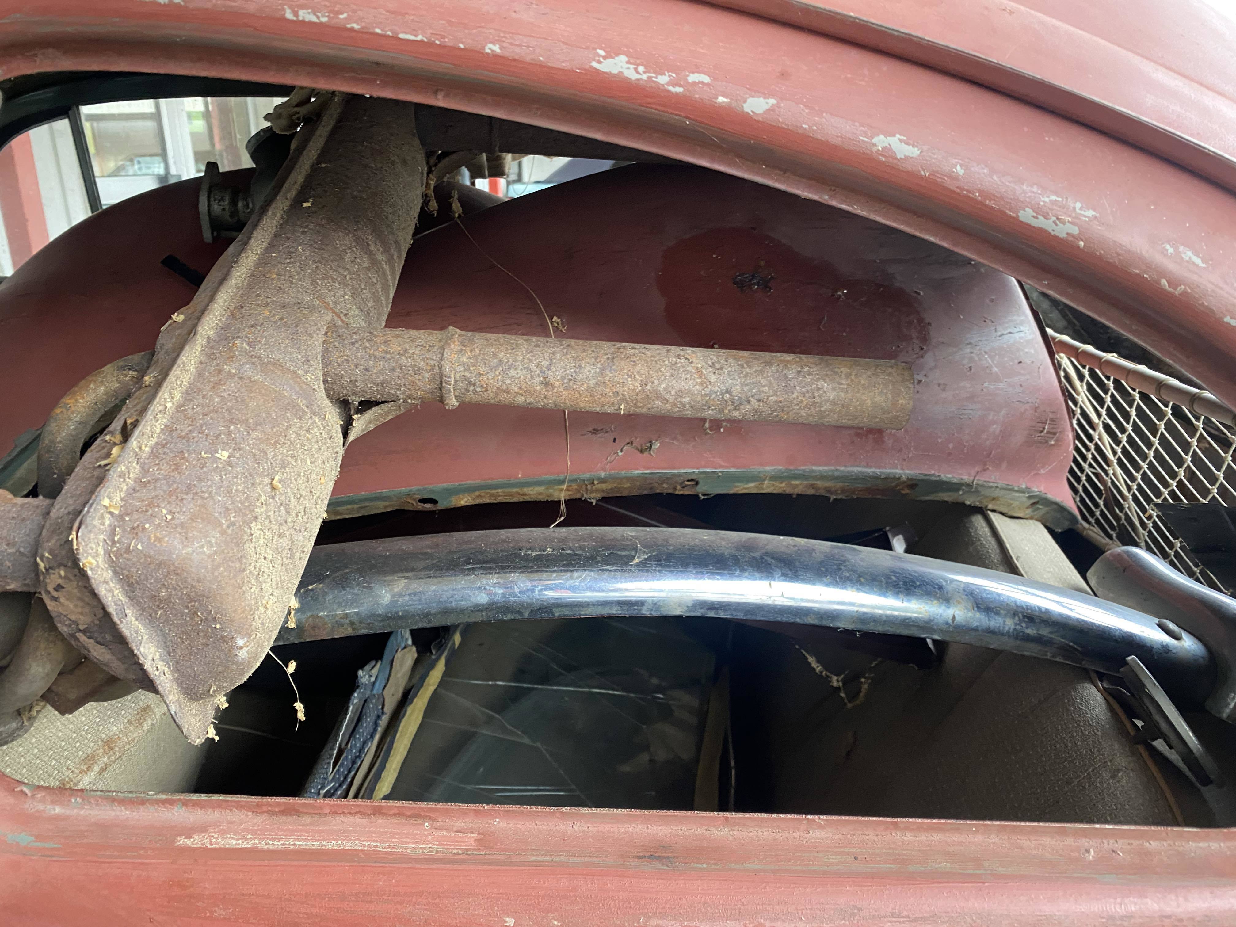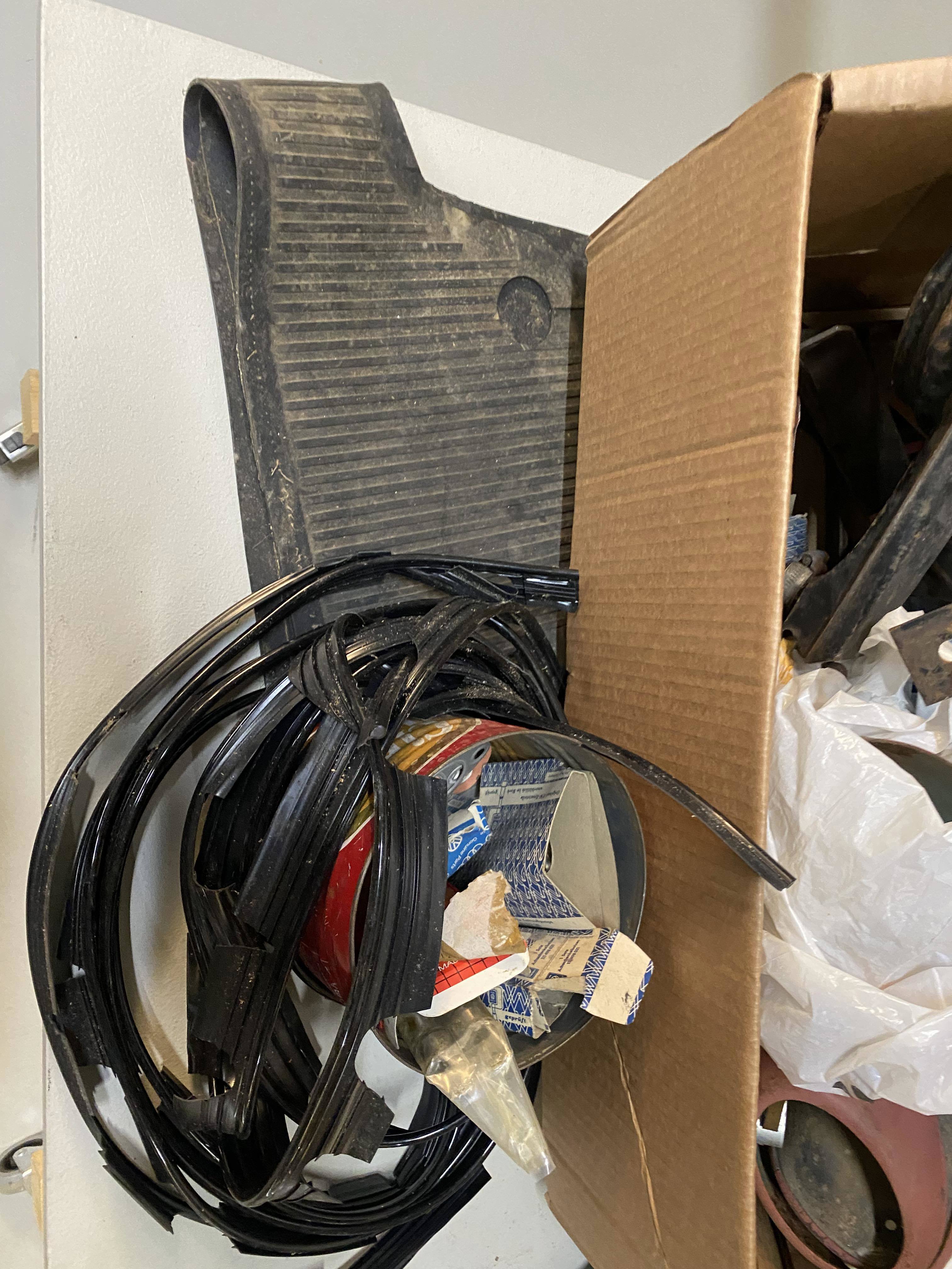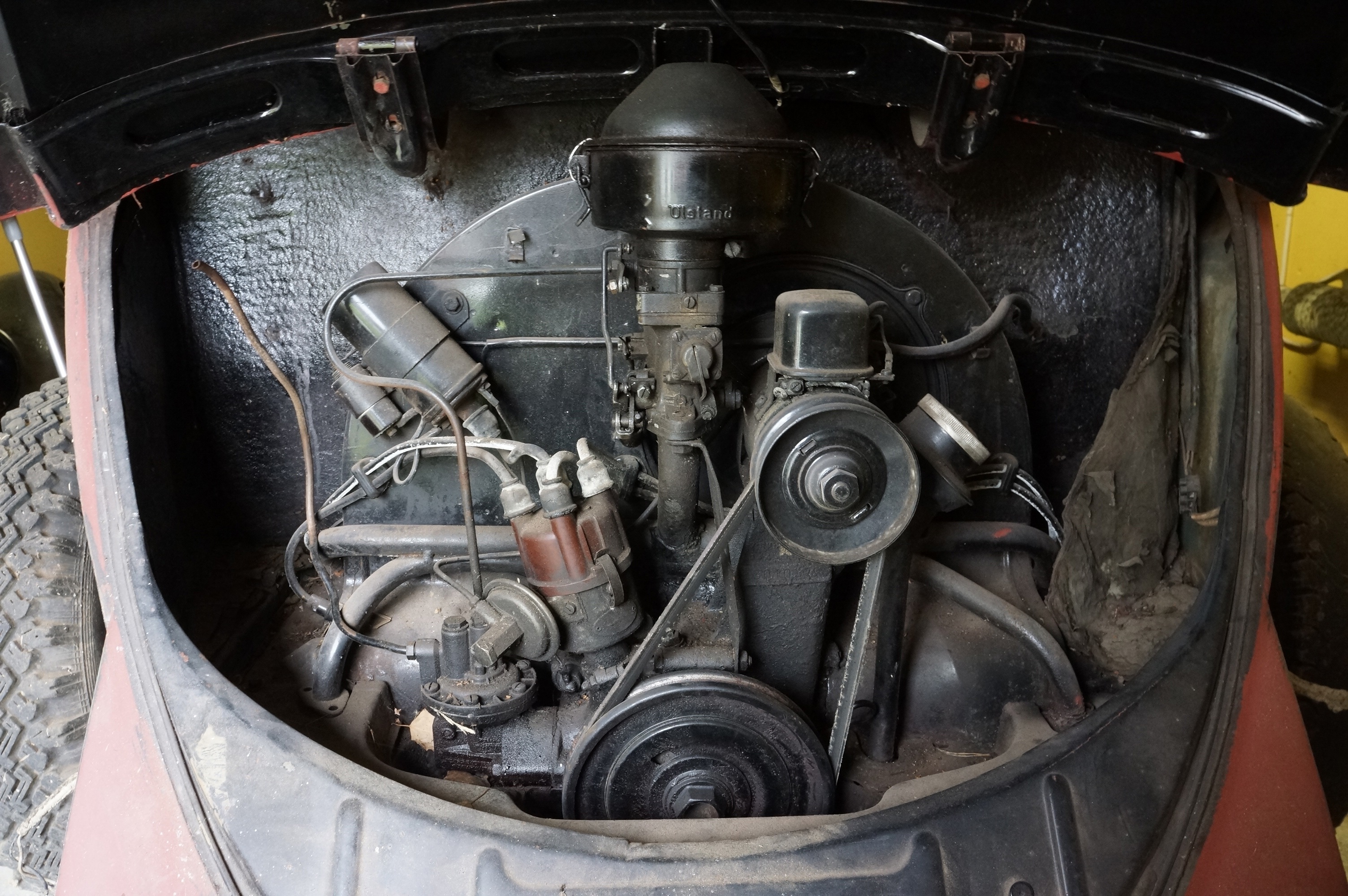 Modifierad med äldre bakruta och original VW soltak. Höger värmekanal bytt, vänster kanal medföljer löst. Medföljer diverse delar, både nytt & gammalt. Rutor finns, framruta trasig. Motorn utbytt, nu sitter en industrimotor från brandspruta i bilen. Renoveringsobjekt.