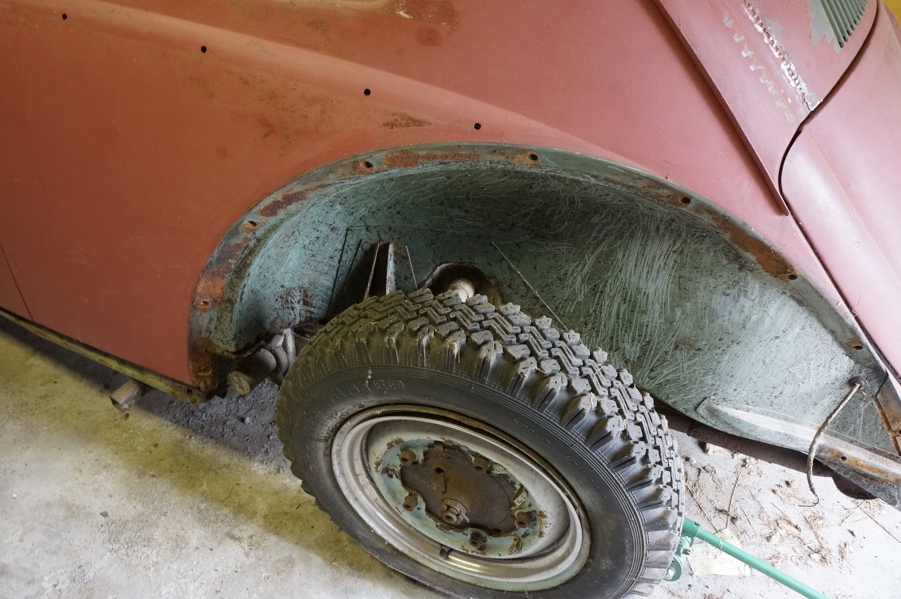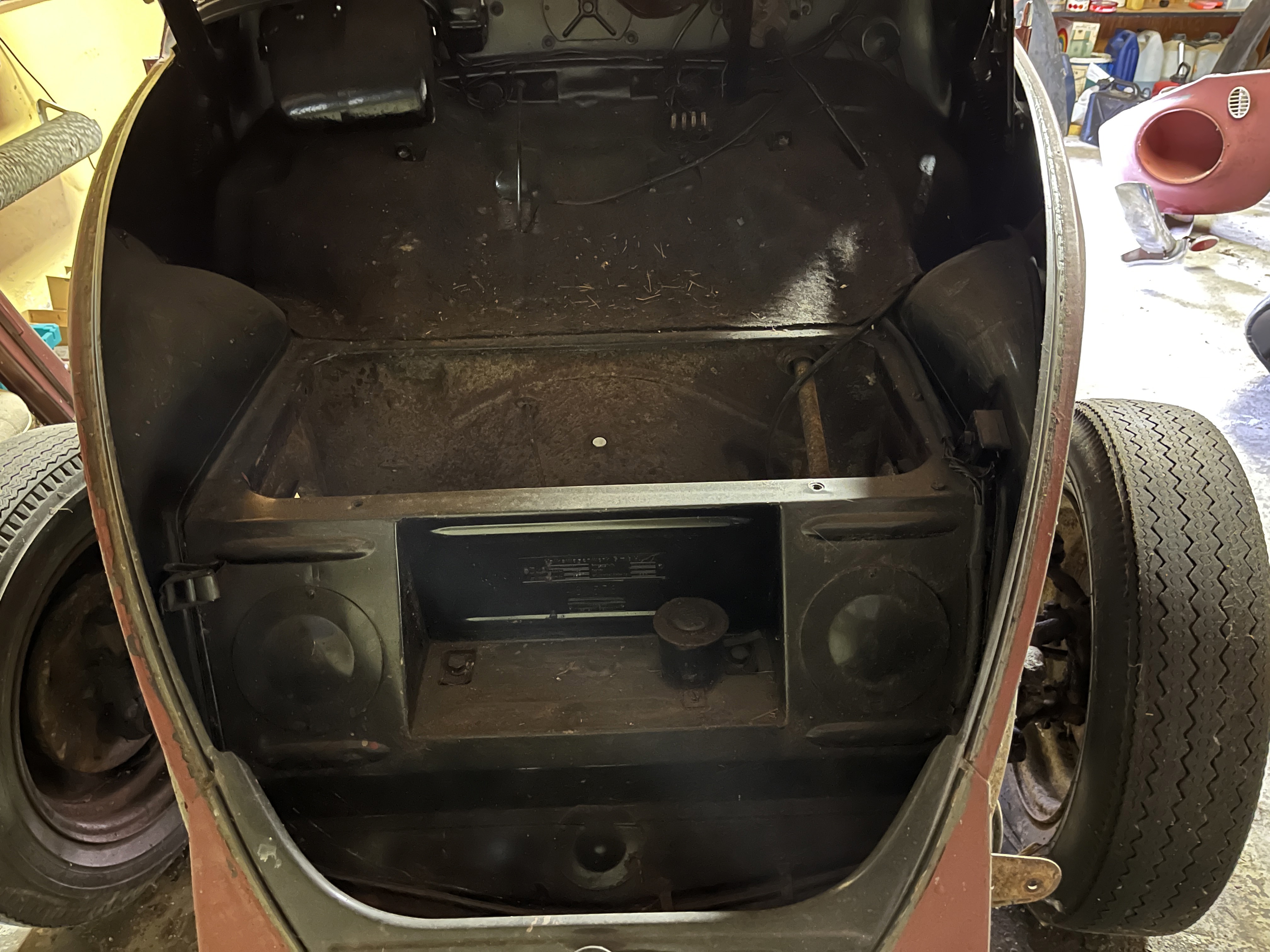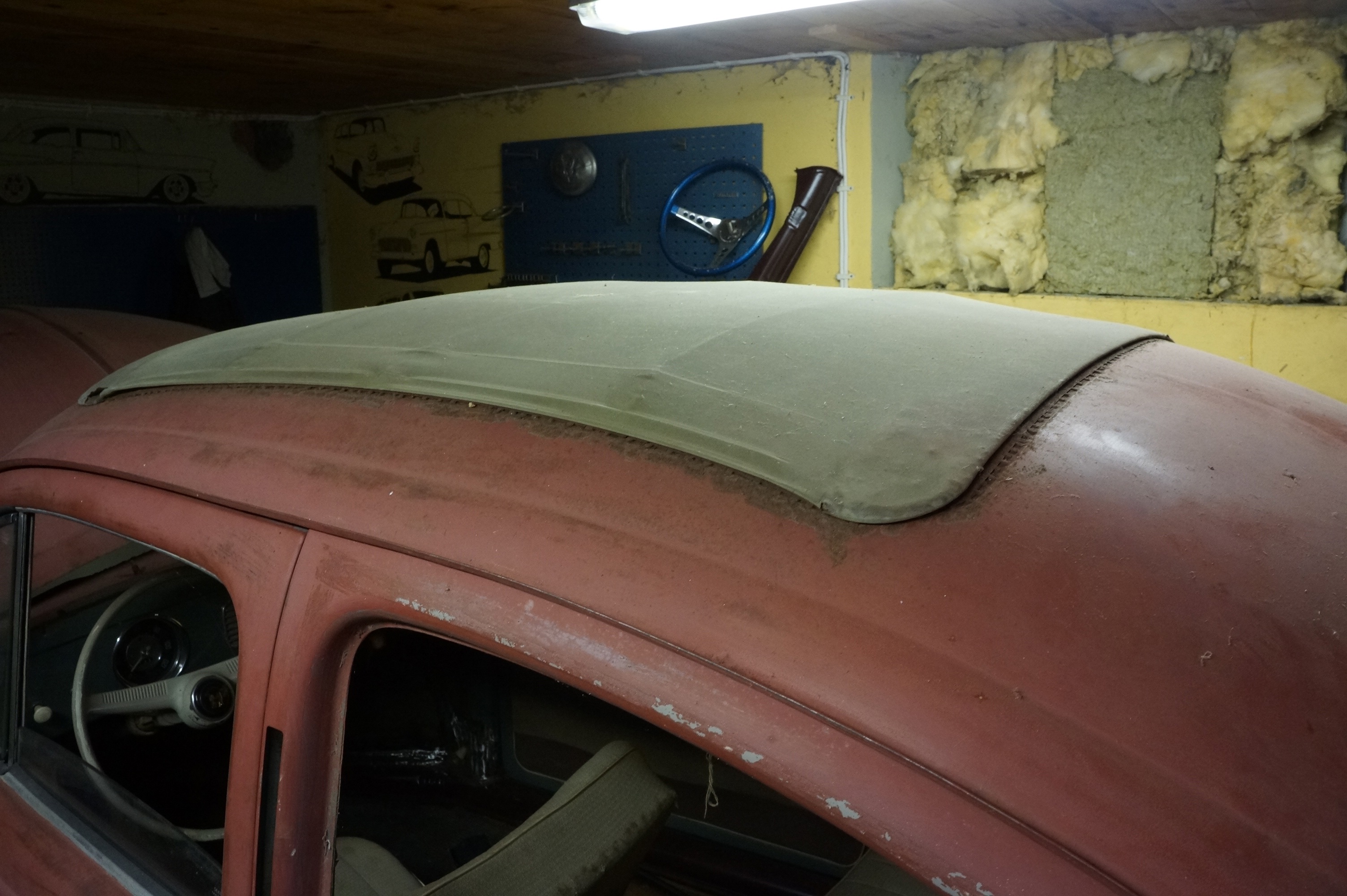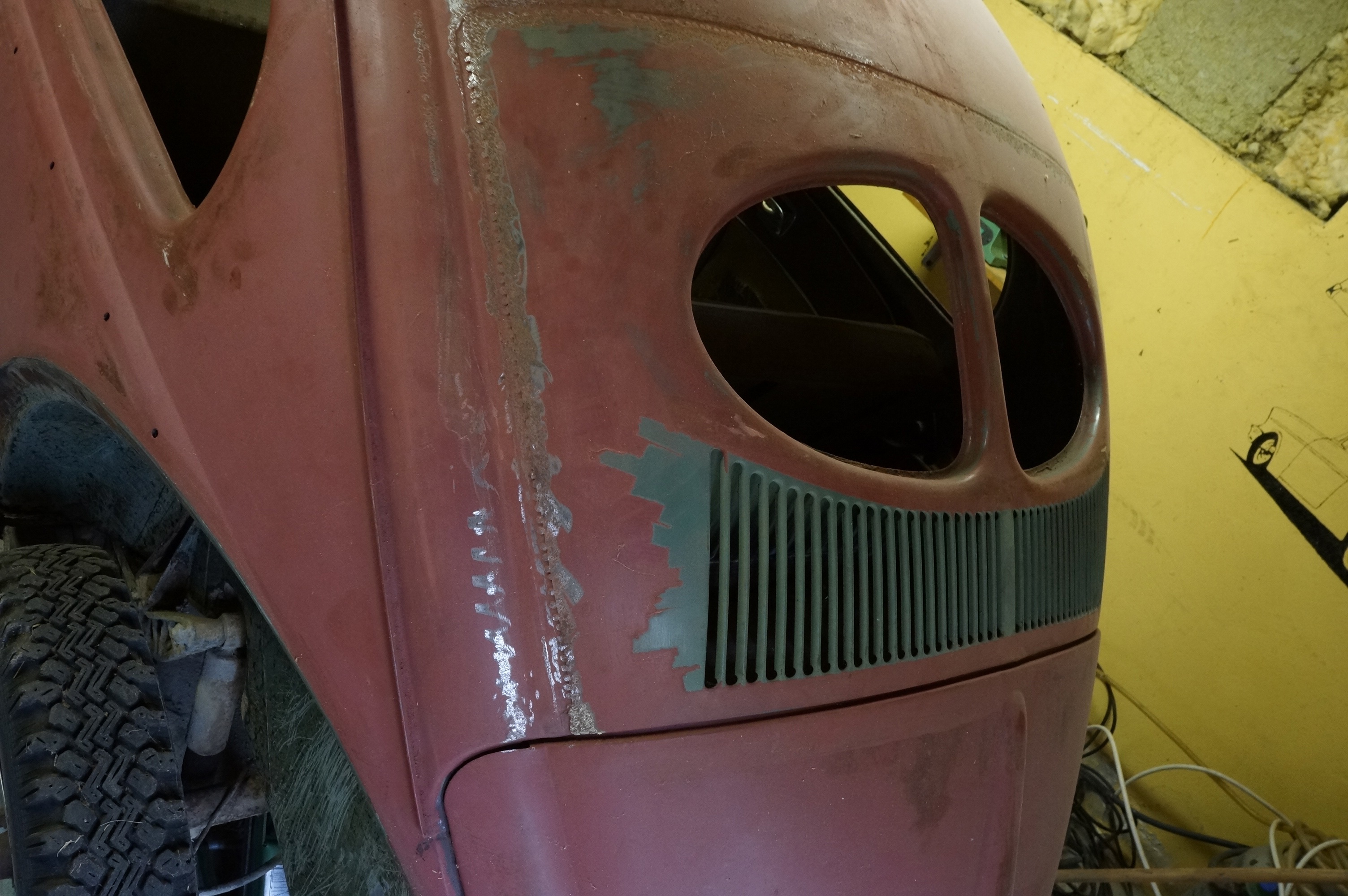 Modifierad med äldre bakruta och original VW soltak. Höger värmekanal bytt, vänster kanal medföljer löst. Medföljer diverse delar, både nytt & gammalt. Rutor finns, framruta trasig. Motorn utbytt, nu sitter en industrimotor från brandspruta i bilen. Renoveringsobjekt.