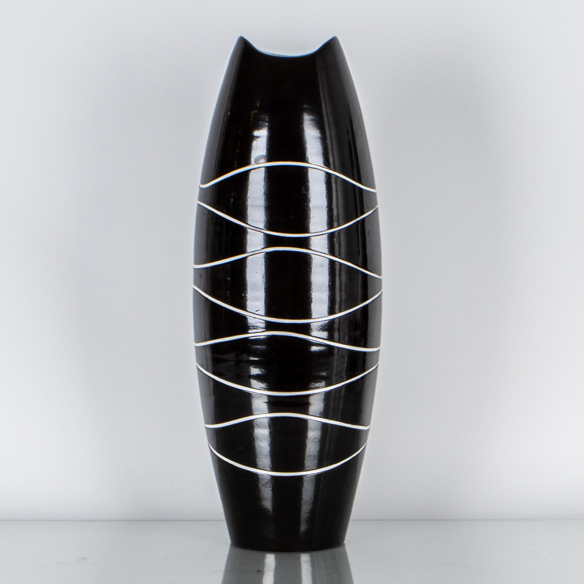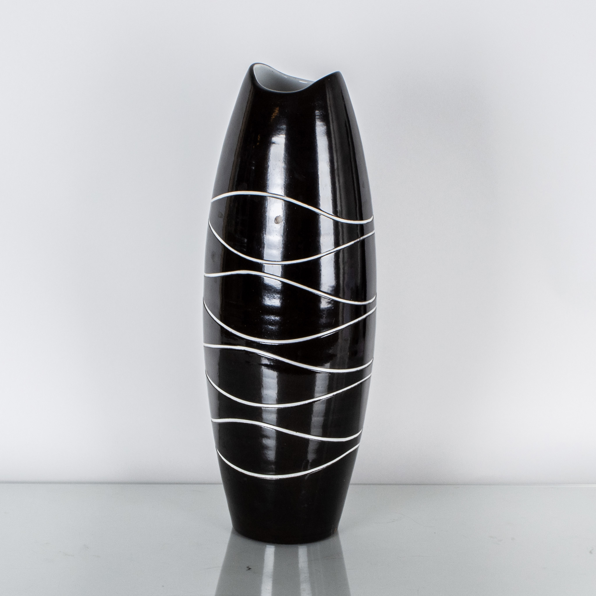 Svart och vit glasyr, i produktion 1957-58, märkt undertill 5112, höjd ca 45 cm