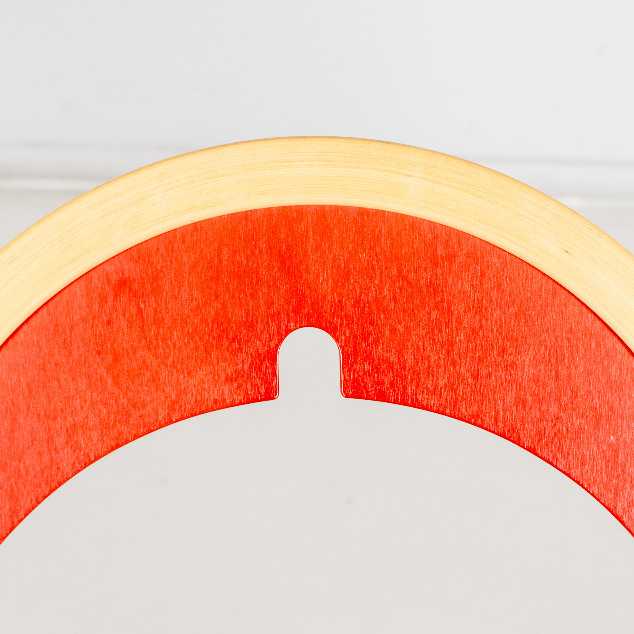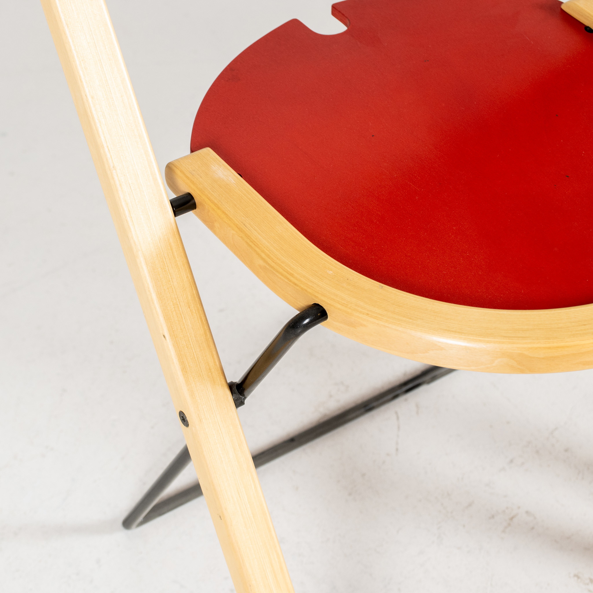 Trä, rödlackerad rygg och sits, sitthöjd ca 45 cm