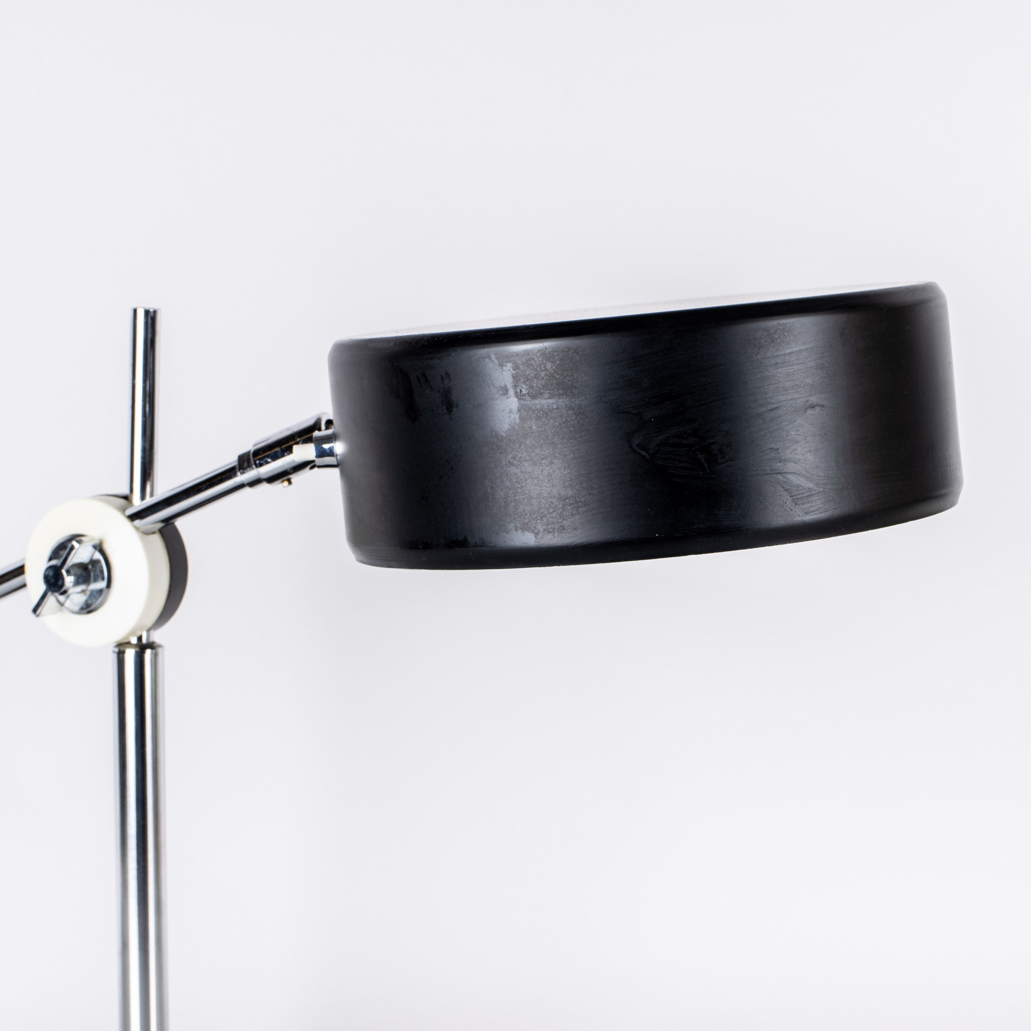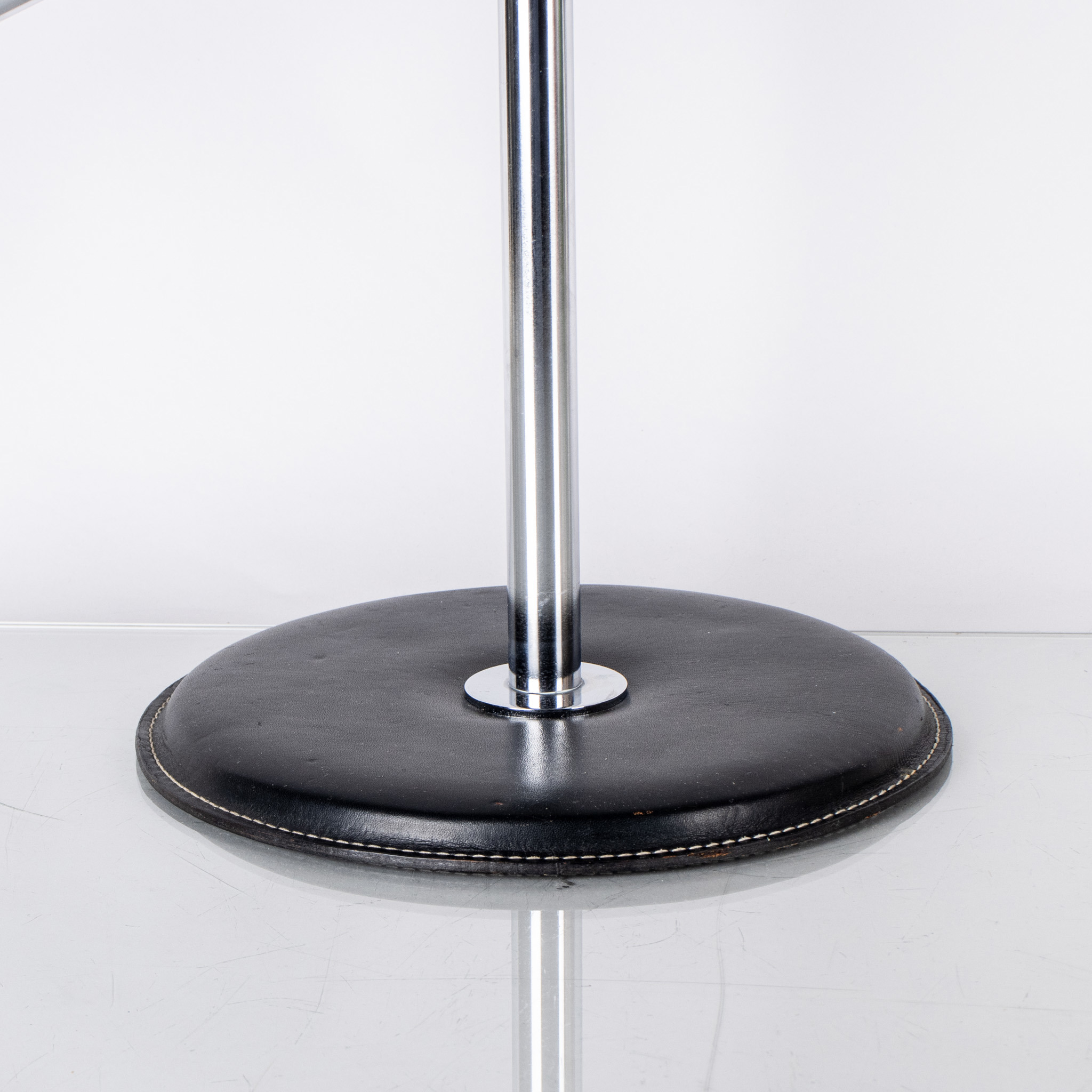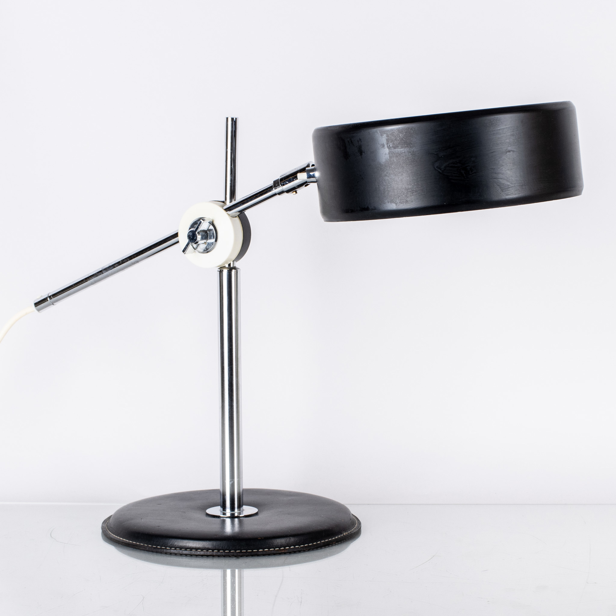 Stomme av kromad metall, läderklädd fotplatta, justerbar skärm, skärm av svartlackerad metall med vit insida, en ljuspunkt, höjd ca