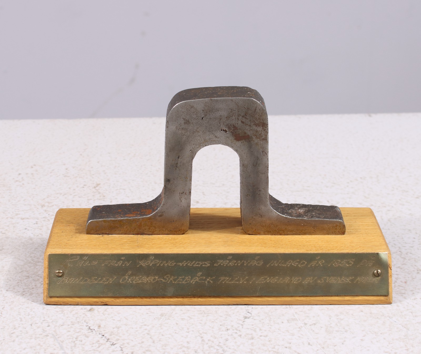 Stål på sockel av trä, brickmärkt med text "Räls från Köping-Hults järnväg inlagd 1853 på bandelen Örebro-Skebäck, tillverkad i England av Svensk malm", mått utan sockel 7,5x13,5x2 cm. (vån3)