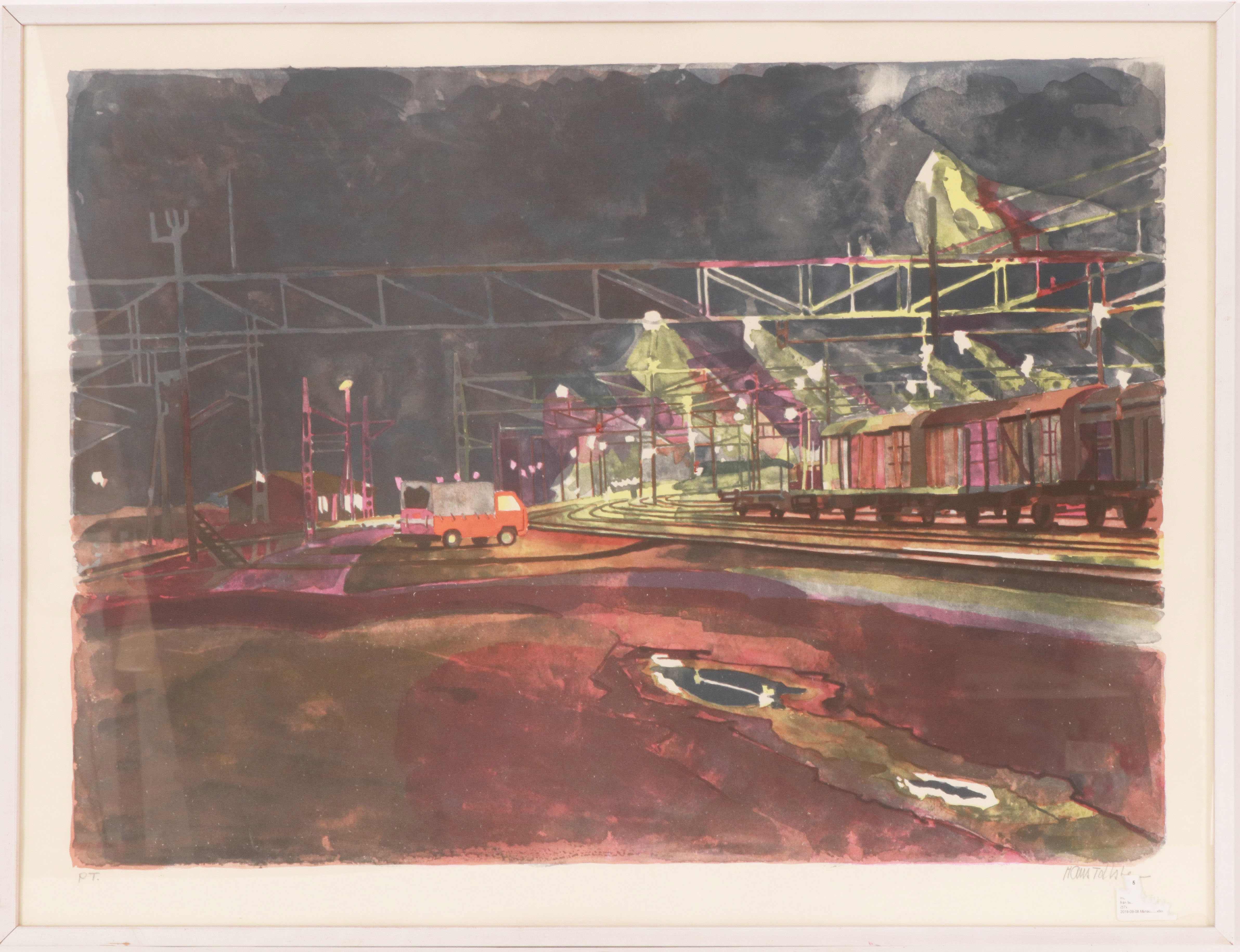 Färglitografi, bangård. Signerat. Provtryck. Inramat.
