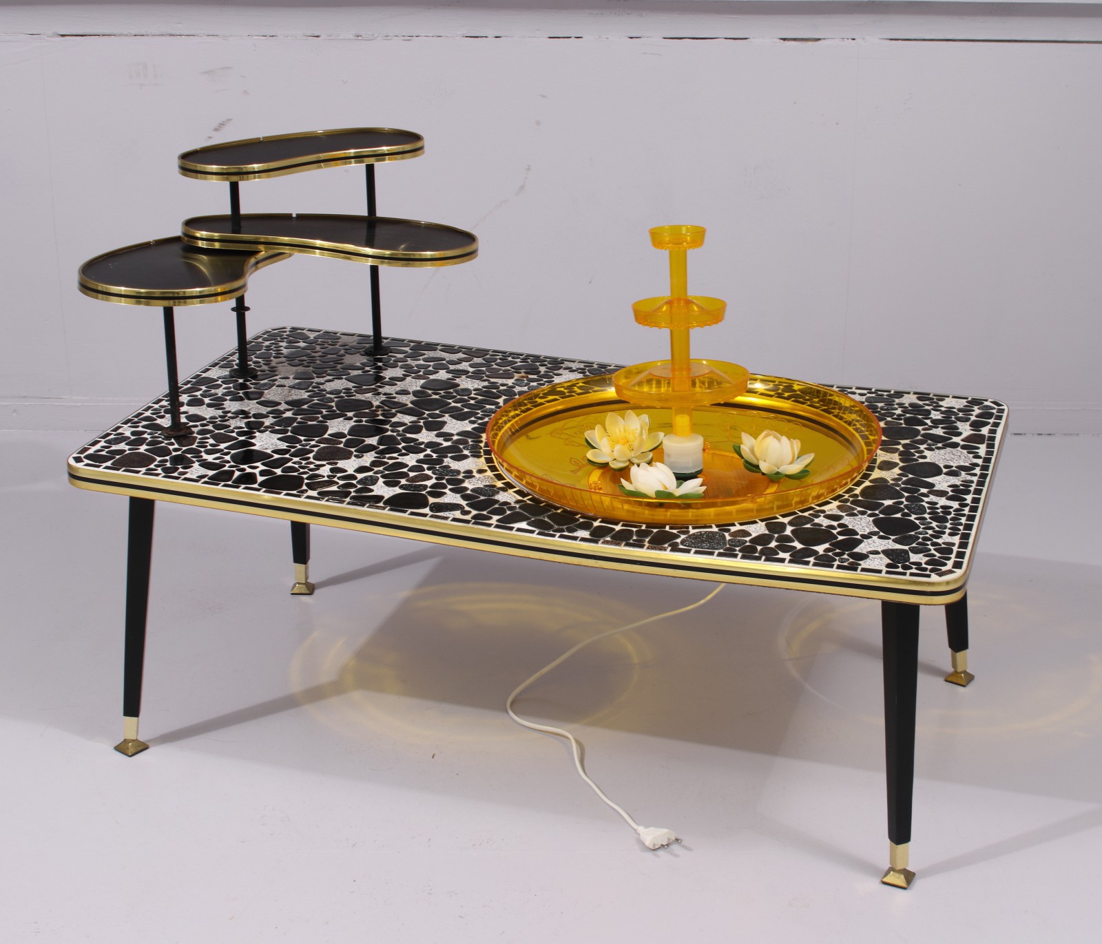 Skiva med mosaik, 1950,60-tal, fontän fungerar, 1st stödpinne till blomhylla saknas (se bild), H.34-60, L.90, B.50 cm. (vån3)