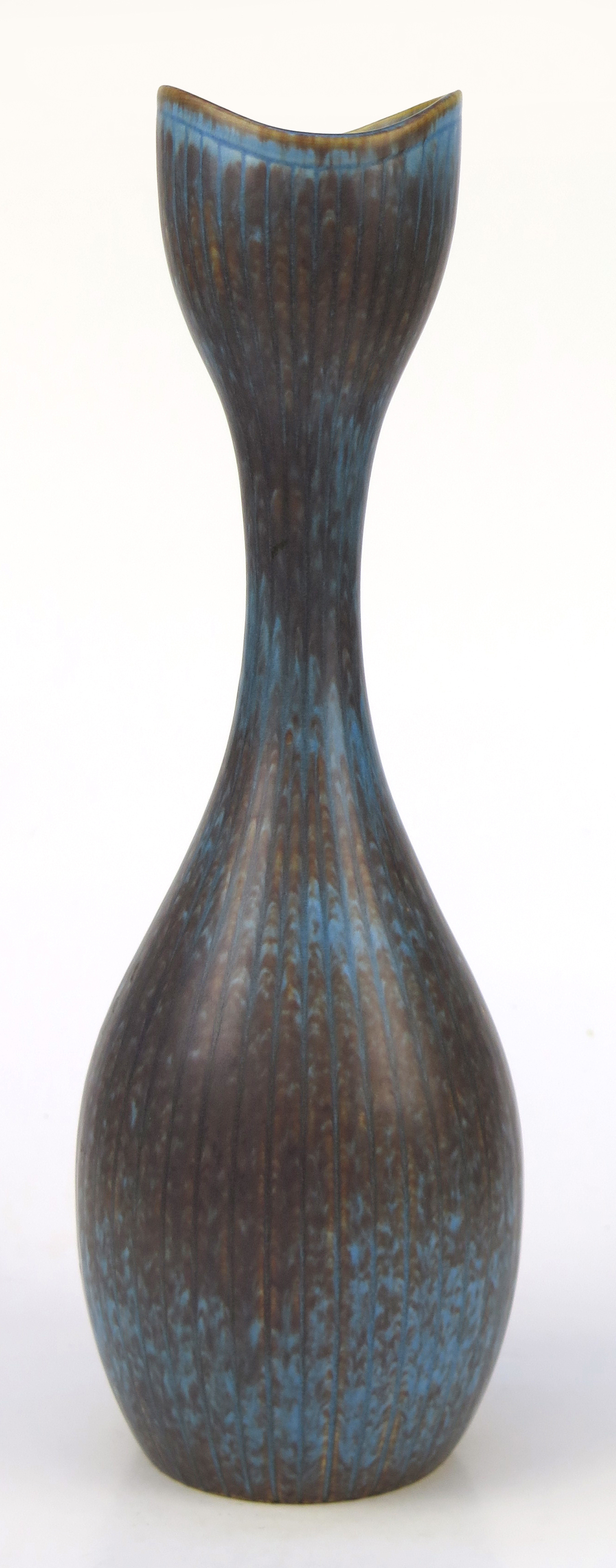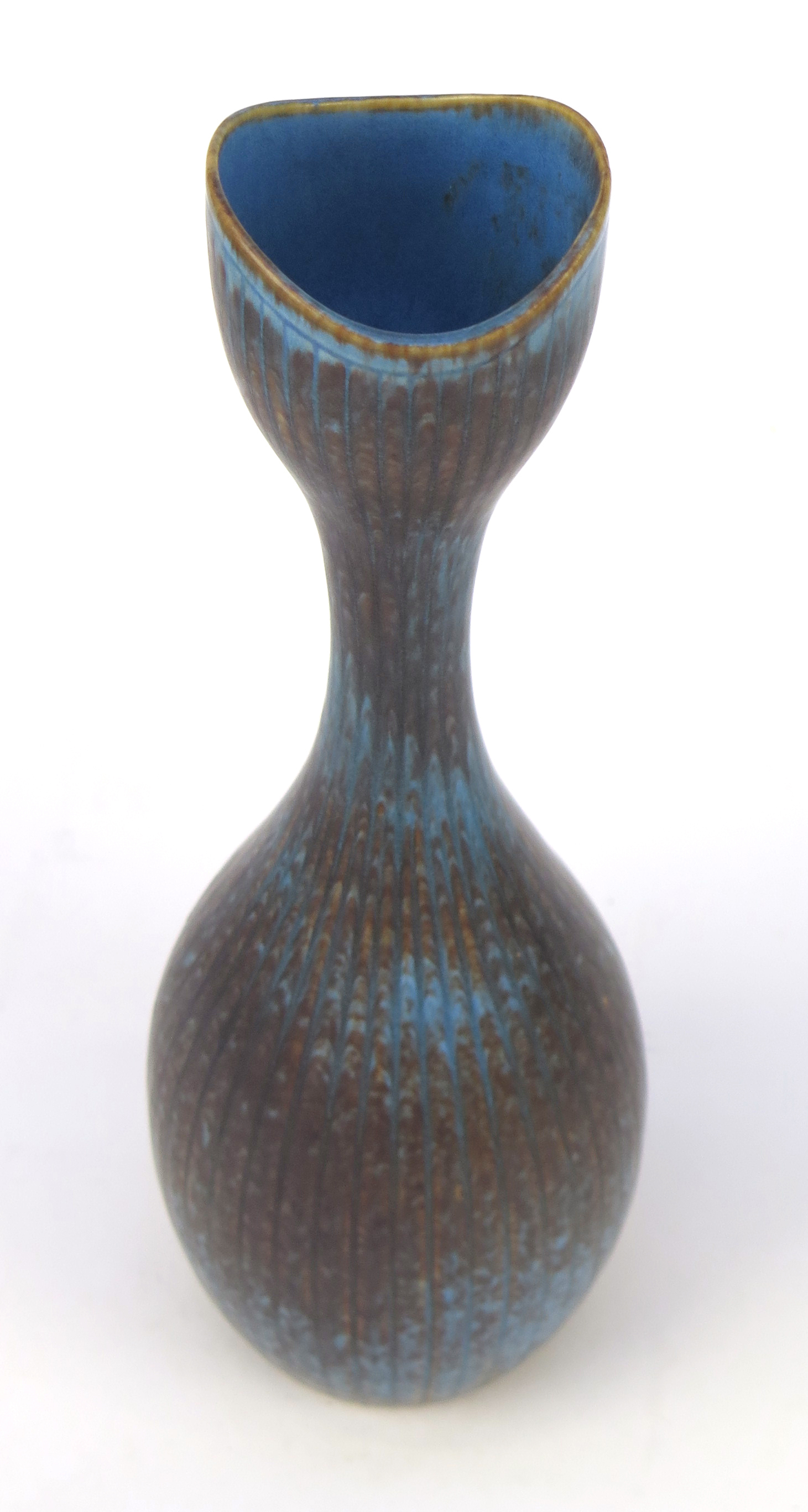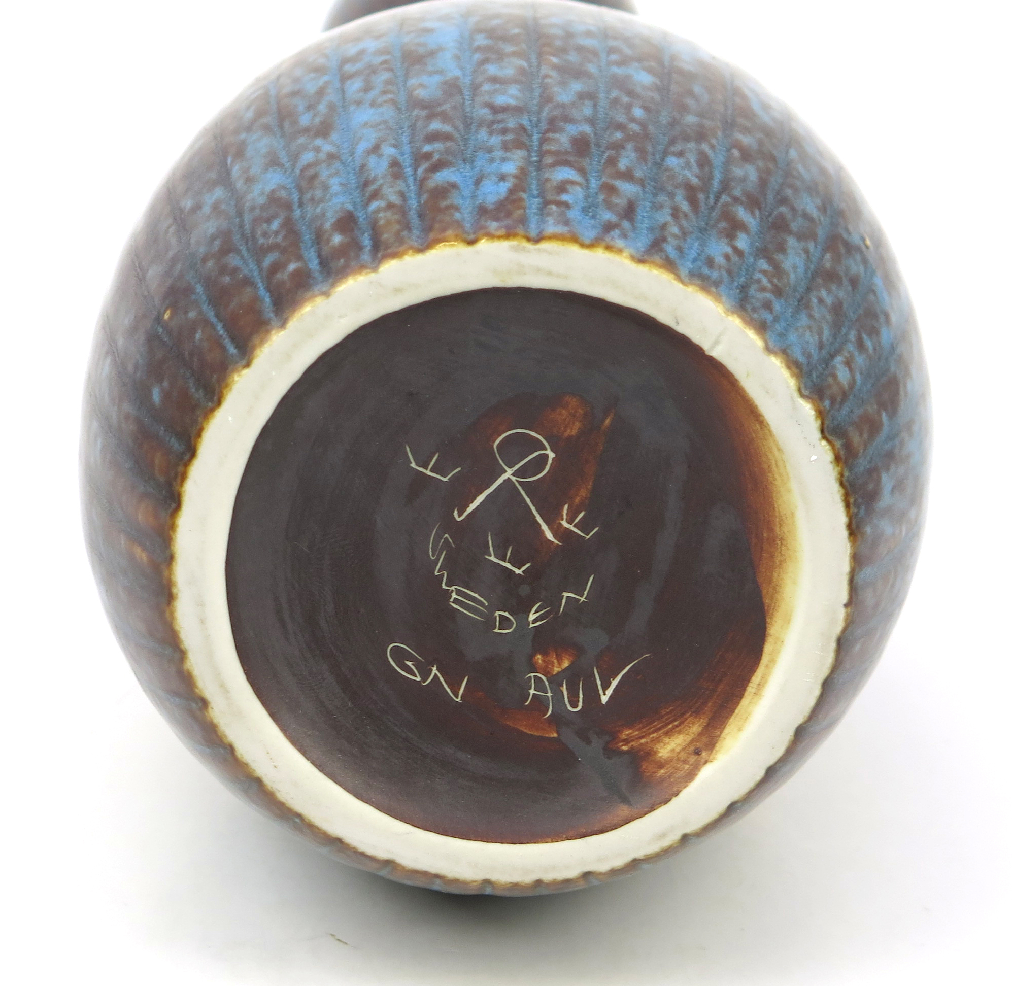 Auktioner Keramik & Porslin Nylund, Gunnar för Rörstrand, vas, stengods, kalebassformad med dekor i blå-brun harpälsglasyr, dekor av vertikala linjer, signerad, h 33 cm