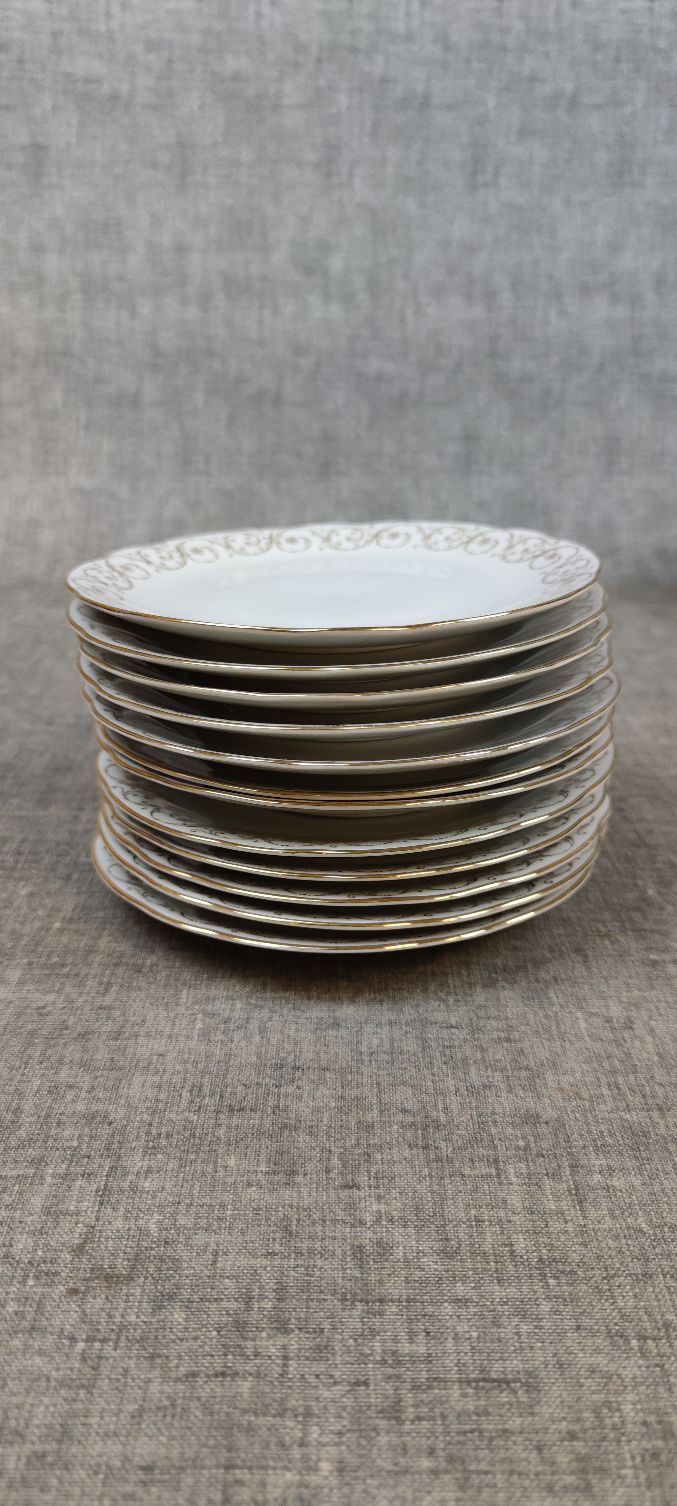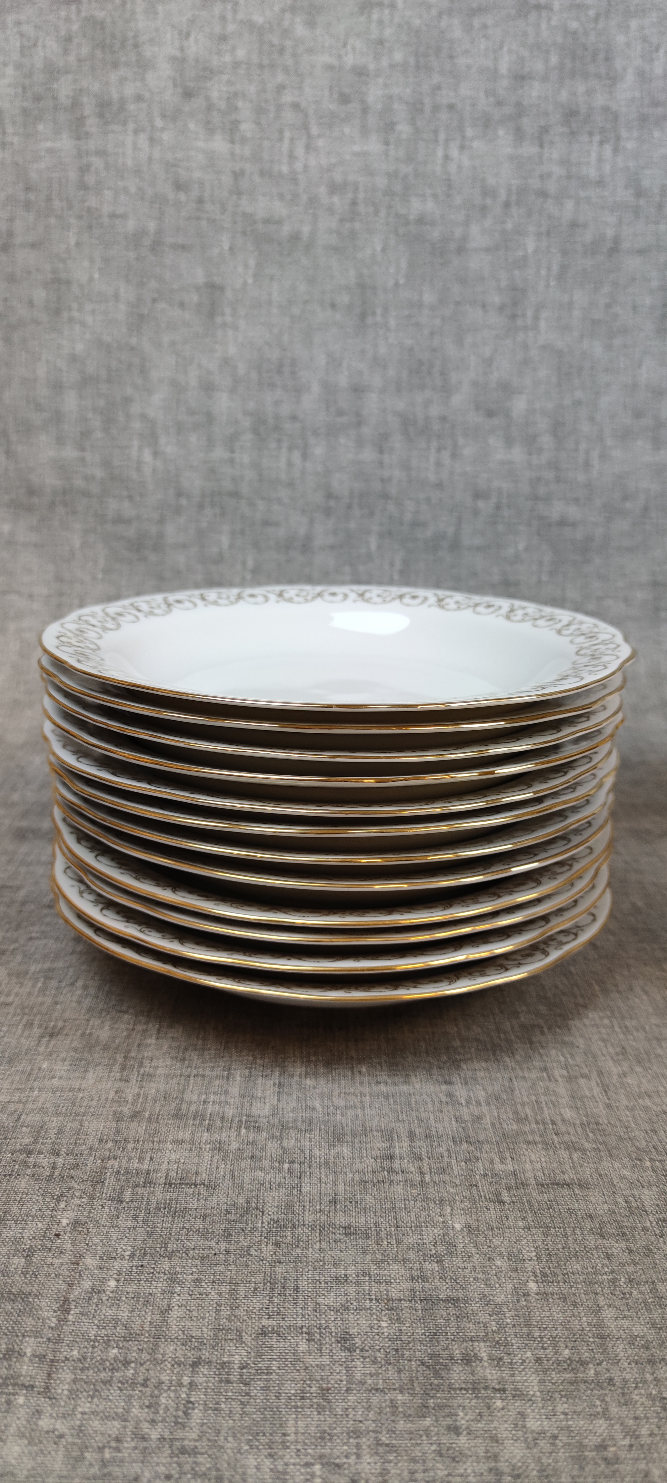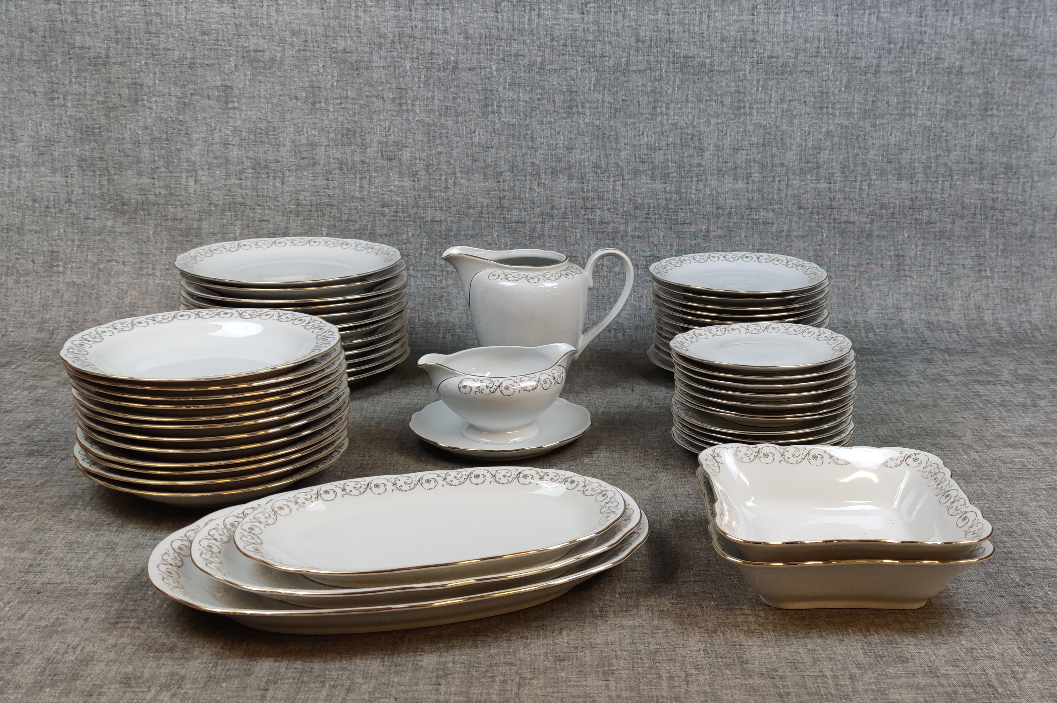 12 Flata tallrikar, 12 Djupa tallrikar, 12 Förrätts tallrikar, 12 Assietter, 5 Uppläggning, 1 Såsskål & 1 Kanna.