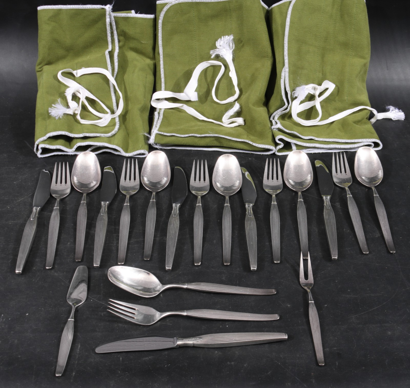 20 delar, nysilver, 6st matgafflar, 6st matknivar, 6st matskedar, 1st senapskniv samt 1st plockgaffel, 3st bestickfodral i tyg medföljer. (vån3)