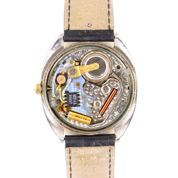 Ca 35 mm exkl. krona (38,5 mm lug-to-lug), guld på stål, klämboett, baklock med gravyr "Svenska Lantmännens Riksförbund, Klas Nilsson, 1978, sliten krona, sannolikt original, mineralglas