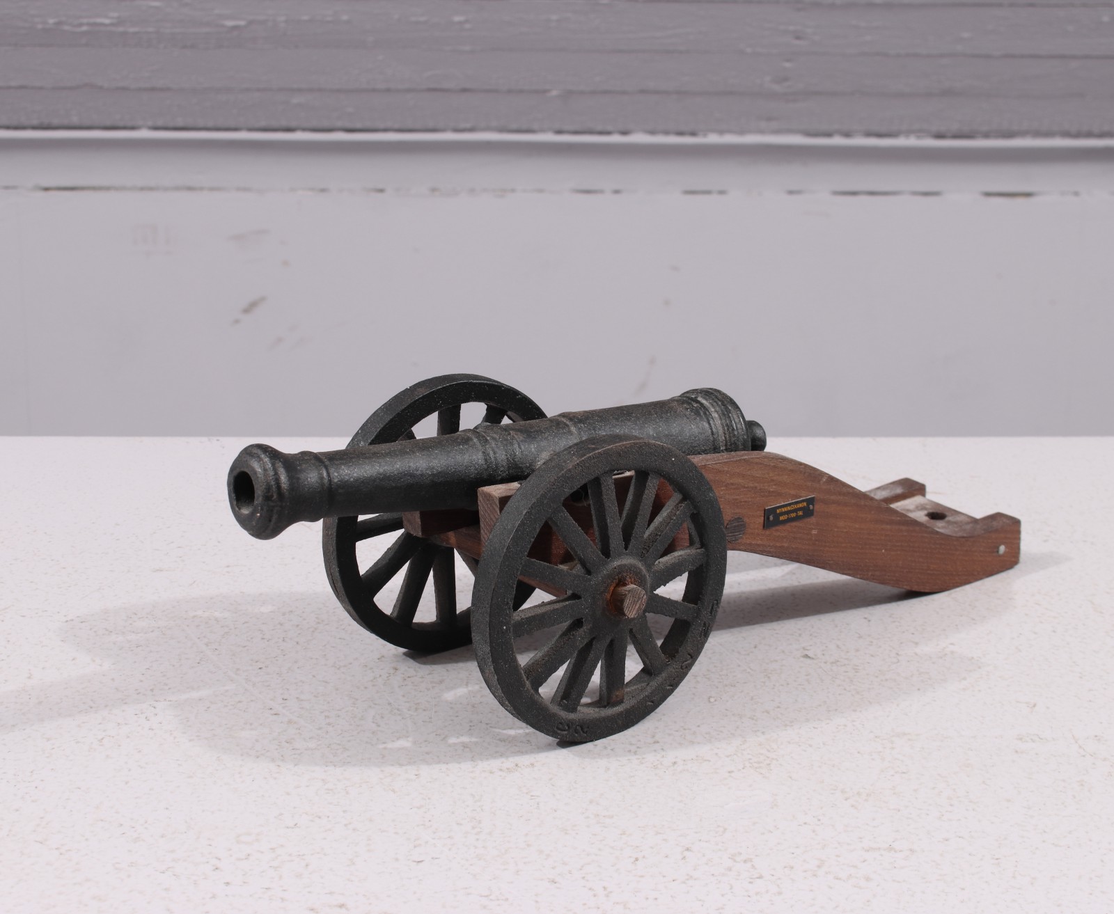 Kanon och hjul i gjutjärn, lavett i trä, 1900-tal, modell av mynningskanon 1700-tal, längd kanonrör 22,5 cm, längd med lavett 35 cm. (vån3)