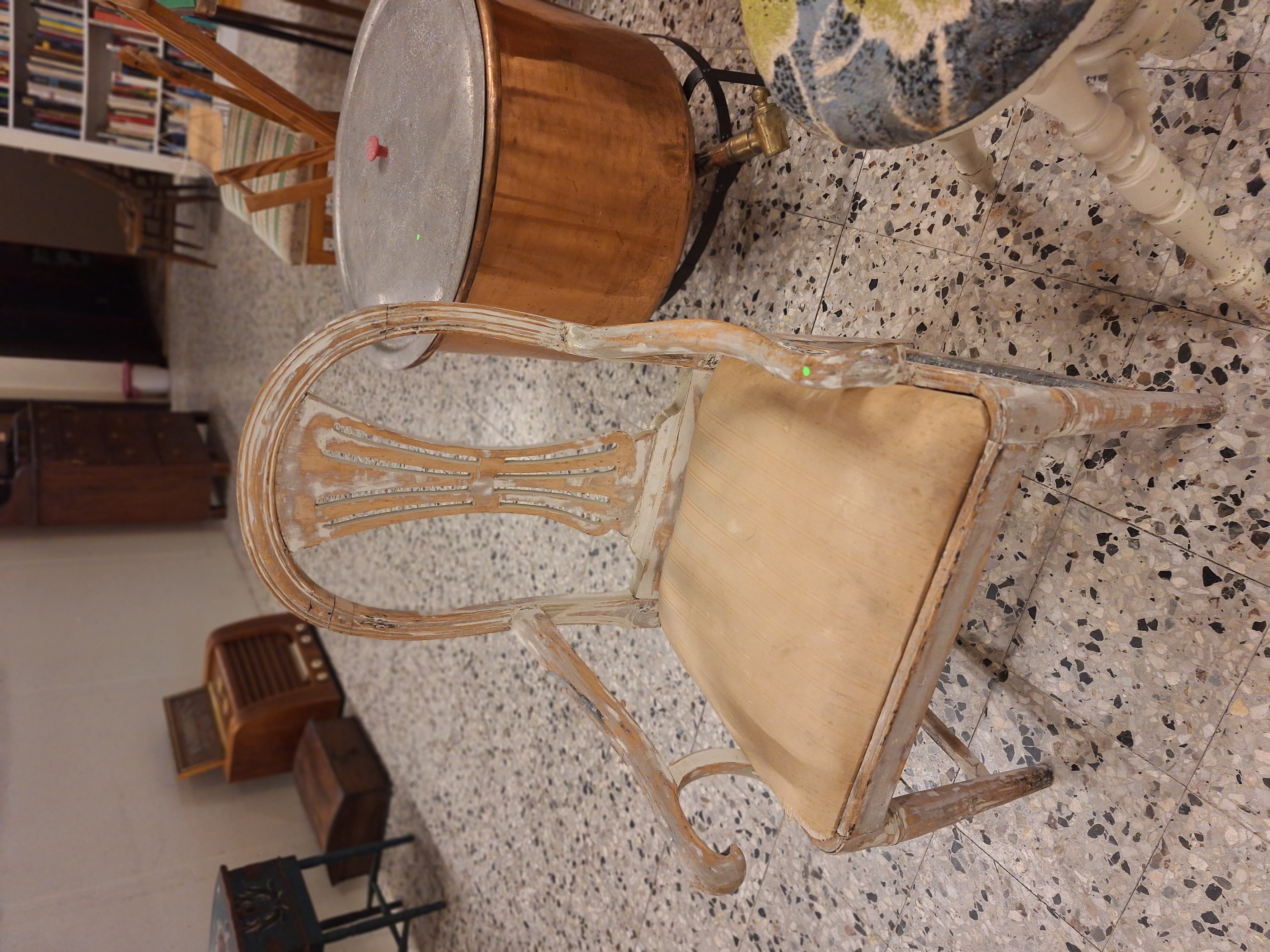 vilstol "Pernilla 3" Dux, stomme av bok, ljus textilklädsel, lös dyna, längd 165, bredd 80 (slitage/skador - i behov av renovering, fläckar)