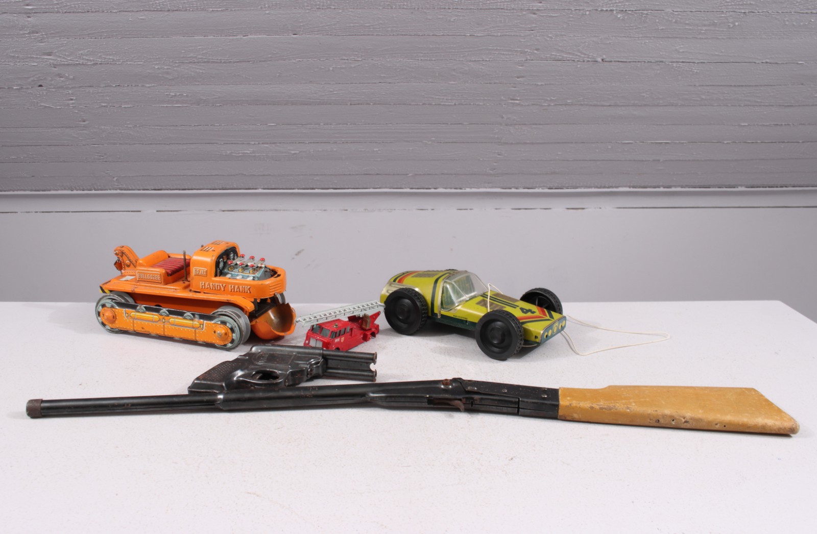 5 delar, skador och slitage förekommer, längd gevär 78 cm, längd bulldozer 26 cm. (vån3)