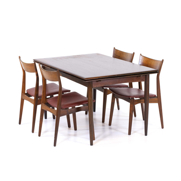 Matmöbel, bord samt 4 stolar klädda med rött konstläder, jakaranda, HP Hansen, ca 1960-tal, Danmark, etikettmärkt