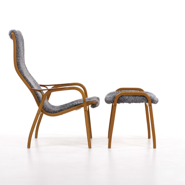 Yngve Ekström, fåtölj med fotpall, "Lamino", stomme i ek med armstöd i teak, klädd i grått fårskinn, jubileumsmodell; "Århundradets möbel", numrerad 188, märkt med plakett, total upplaga om 650 st, tillverkade 2000-2001, Swedese, brännmärkt